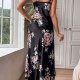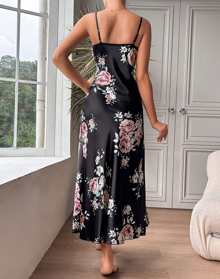 This elegant floral slip dress features a soft, flowing silhouette with delicate spaghetti straps and a graceful open back. The black base is adorned with vibrant pink and white rose patterns, creating a romantic and timeless look. Made from a smooth, lightweight fabric, it drapes beautifully over the body, offering comfort and effortless charm—perfect for lounging or slipping into after a long day.