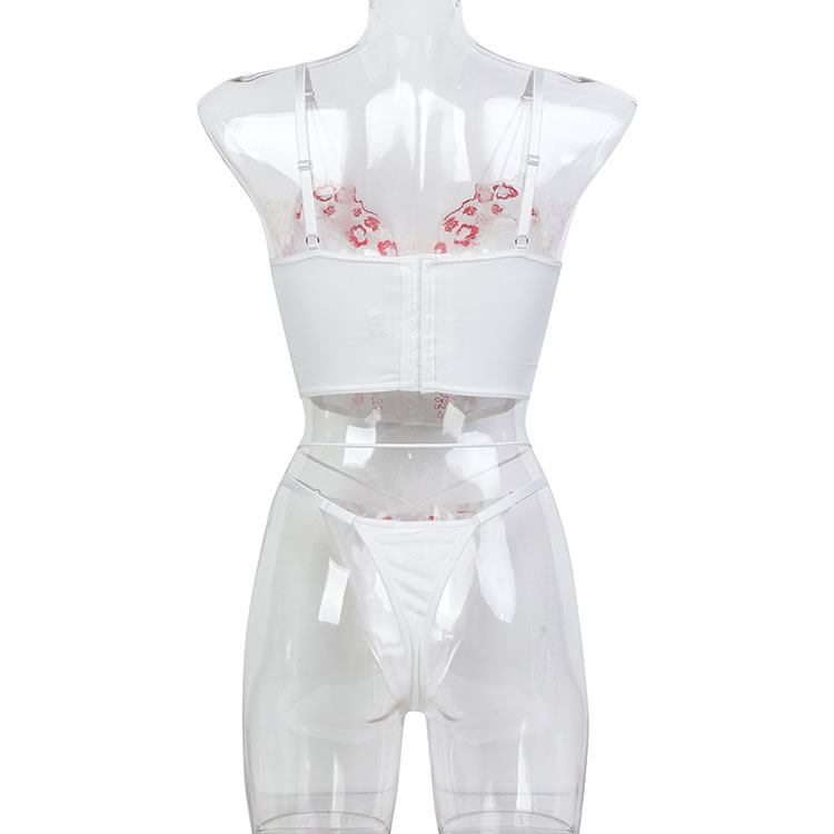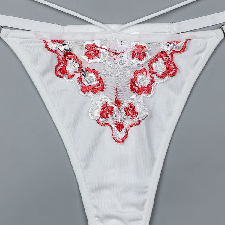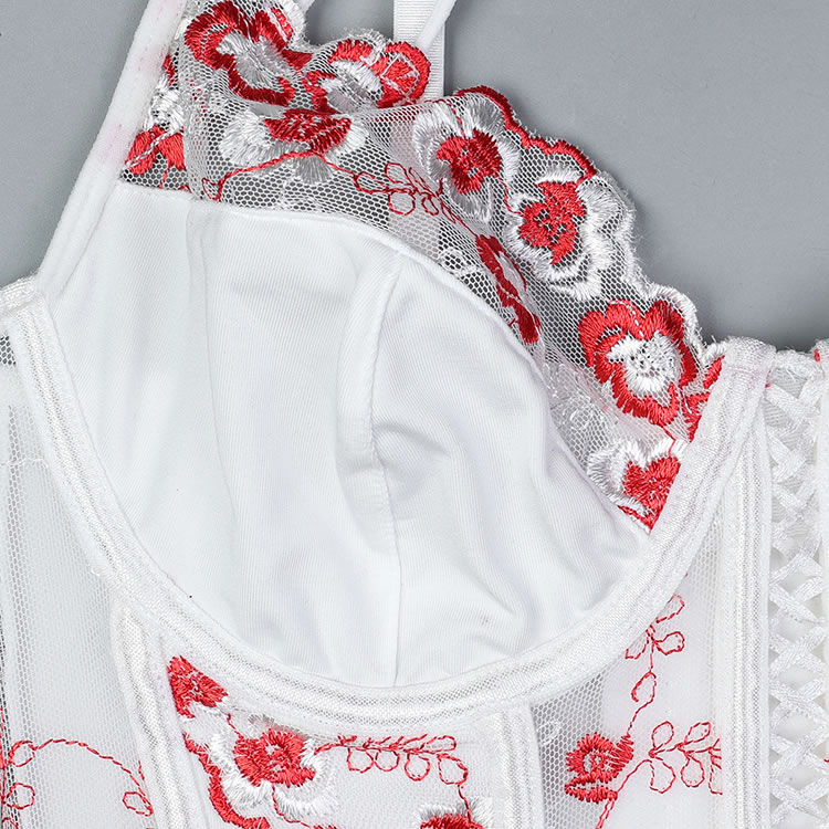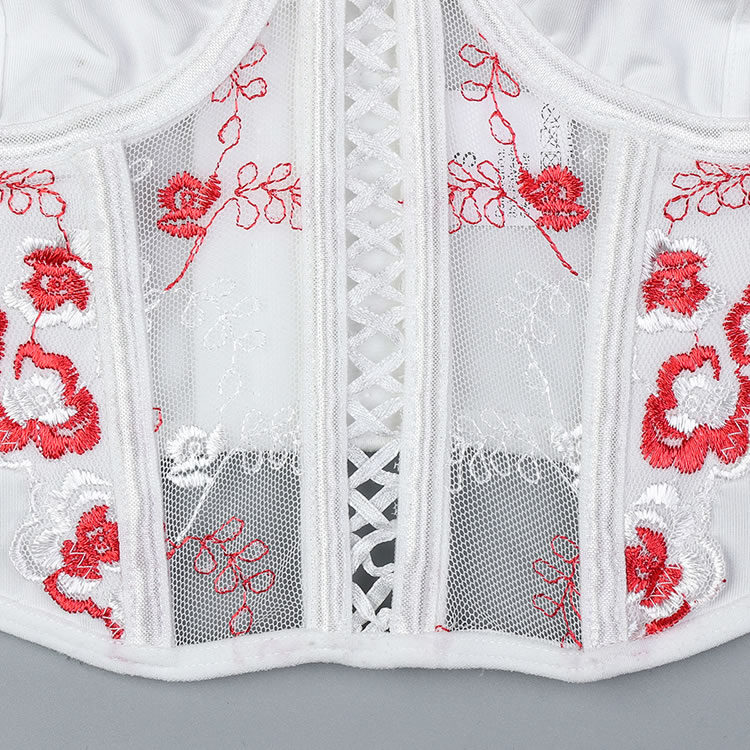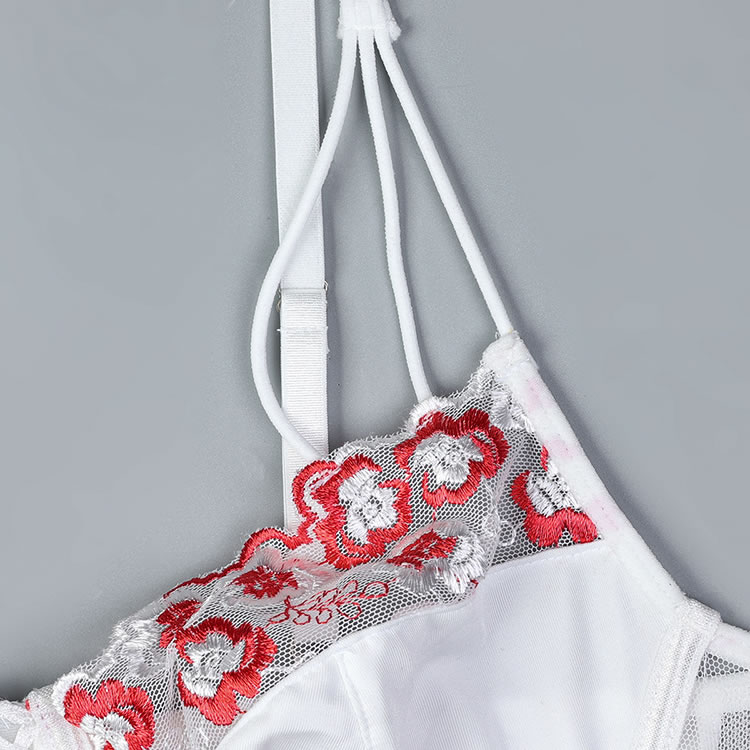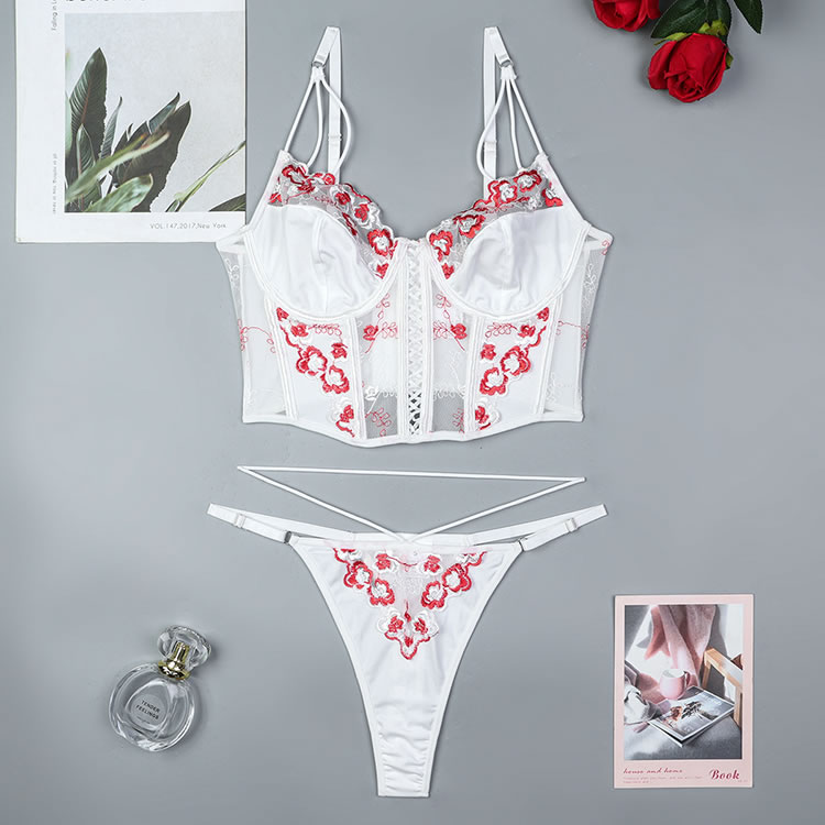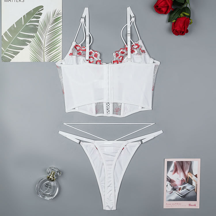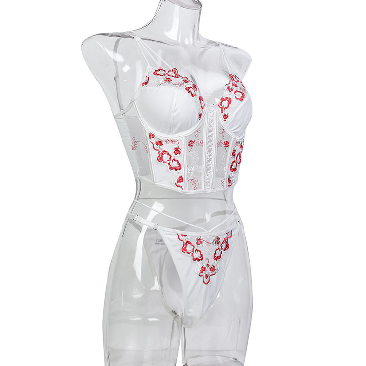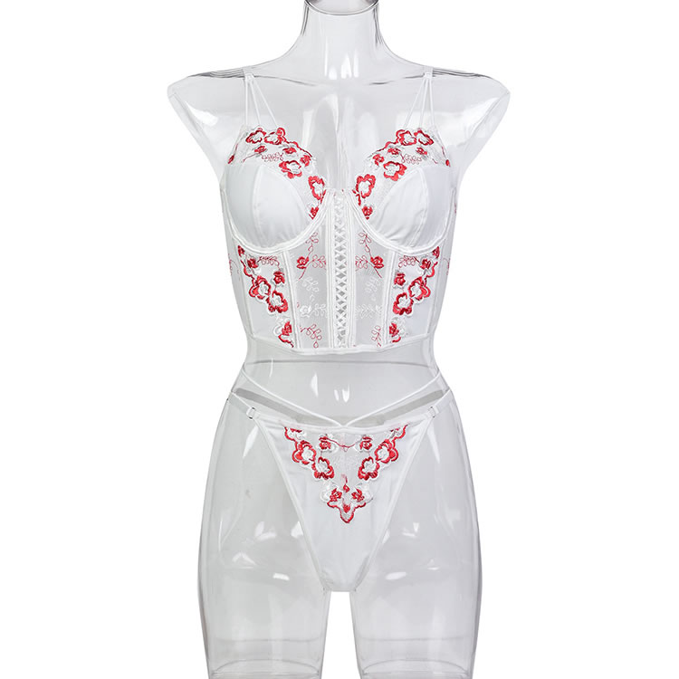 This exquisite white corset set features intricate floral embroidery in vibrant red accents, creating a delicate yet striking design. The structured bodice with a lace-up front enhances your curves, while the matching thong with embroidered details completes the look. Adjustable straps ensure a perfect fit, blending elegance with a touch of romance.