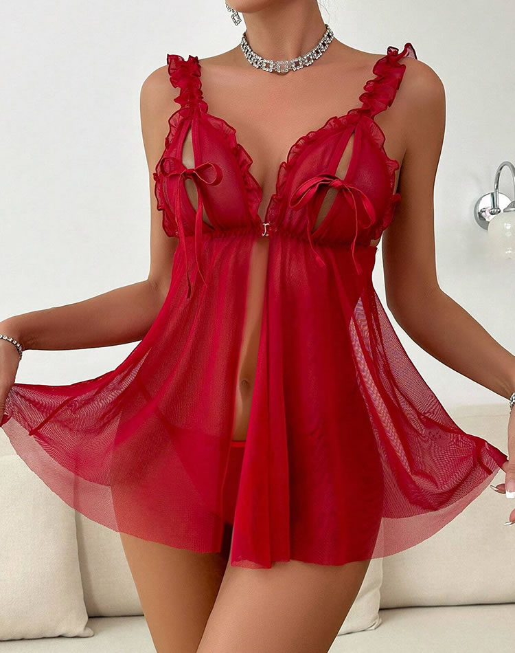 Add a touch of sensual whimsy to the bedroom in this flirty babydoll set featuring sheer mesh cups with peekaboo open panels and tie closures, a ruffled trim, adjustable spaghetti straps with ruffled detailing, a sheer mesh flyaway skirt with a front hook closure, and a matching G-string.