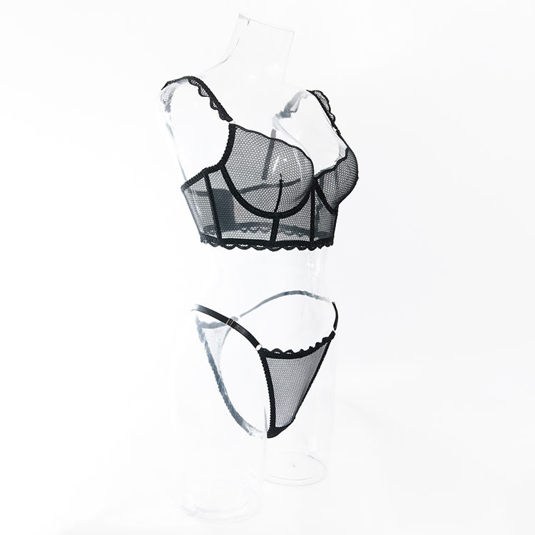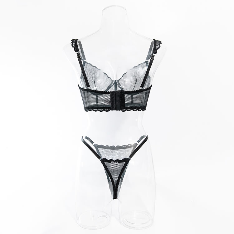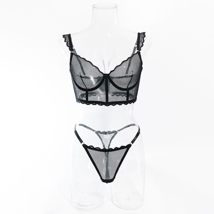 Accentuate your curves with this stunning exclusive lingerie set, available in black. This two-piece ensemble features an underwire bra with adjustable straps and a hook and eye back closure, paired with a matching thong bottom to complete the seductive look.