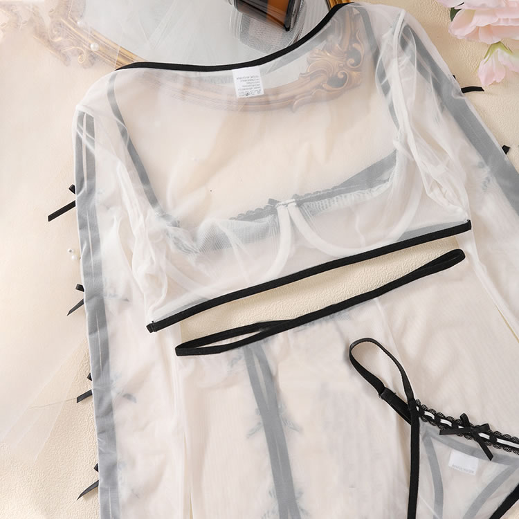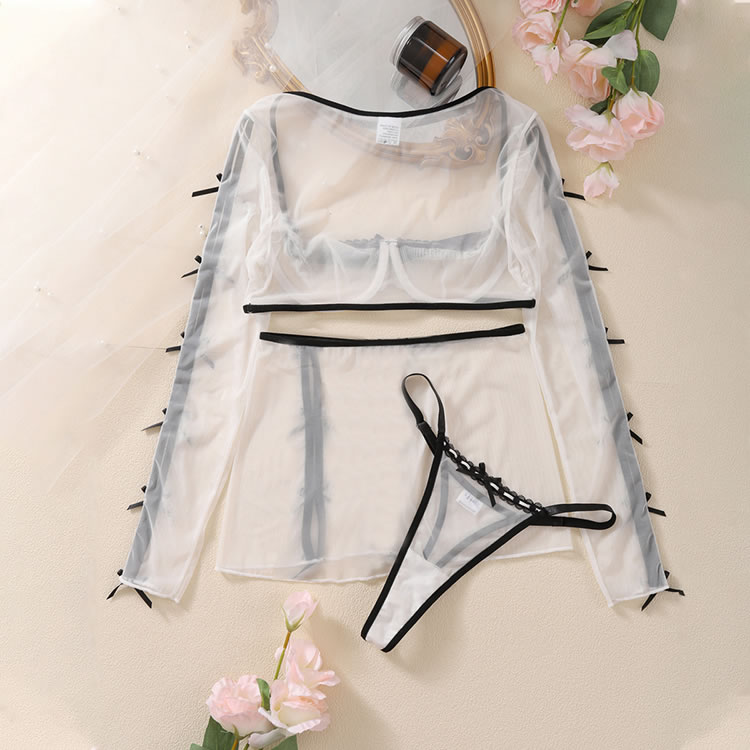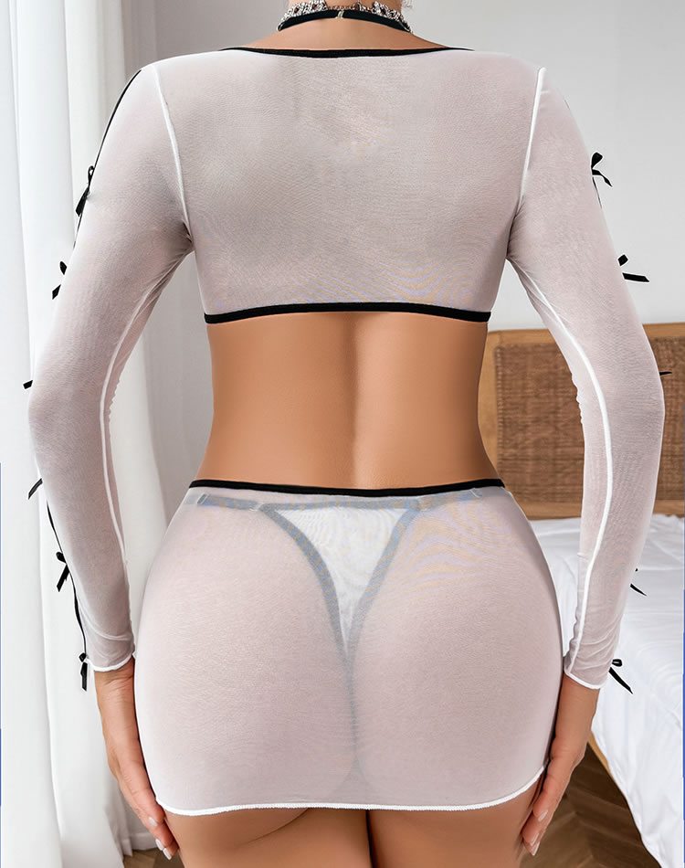 Whether you're in the bedroom or at the club, let your curves do the talking in this exclusive 3-piece set featuring a sheer mesh underwire cup bra with long sleeve, sheer mesh skirt, and a matching thong panty.