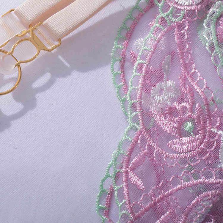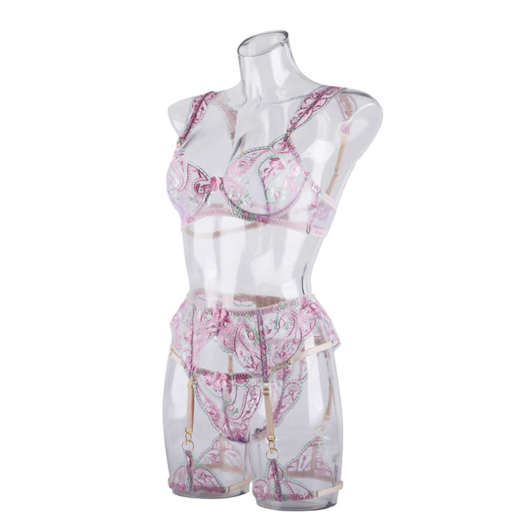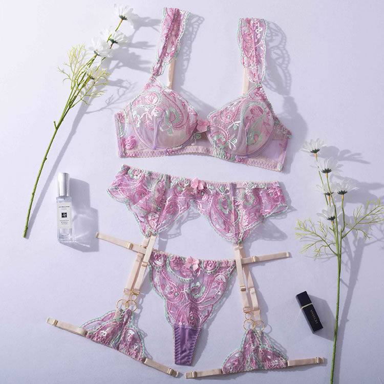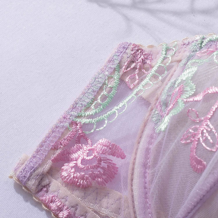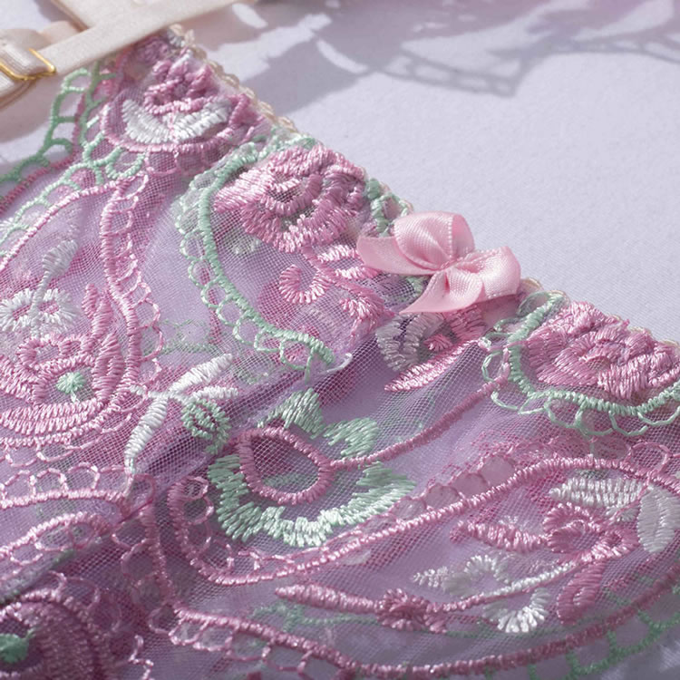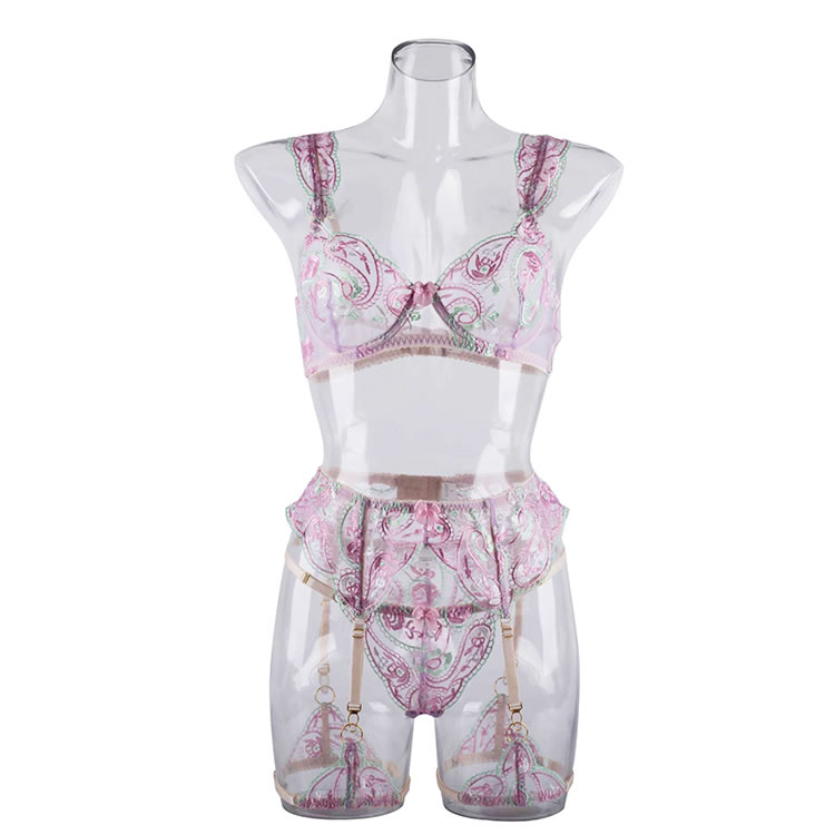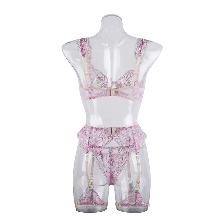 Embrace your femininity in this sexy mesh bra set featuring sheer underwire cups with floral embroidery detailing, adjustable spaghetti straps, a hook and eye back closure, a matching high waisted garter belt with adjustable garter straps, wraparound leg garters, and a matching thong panty.