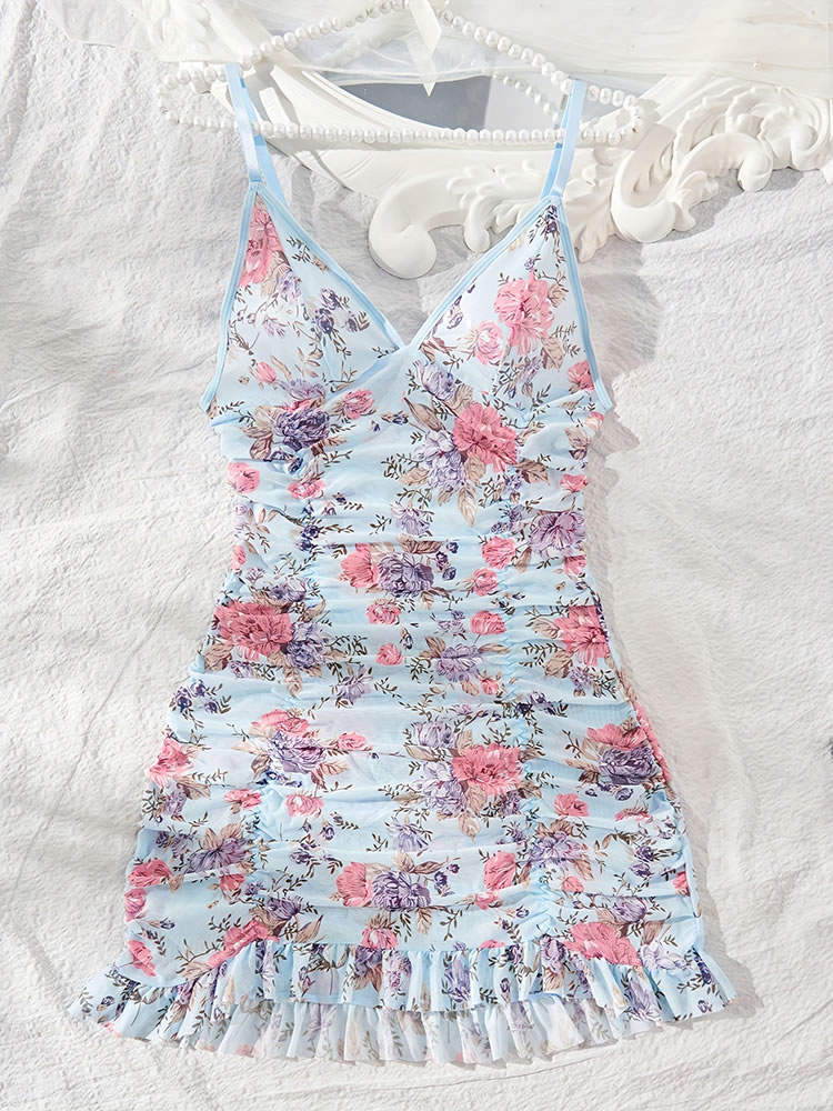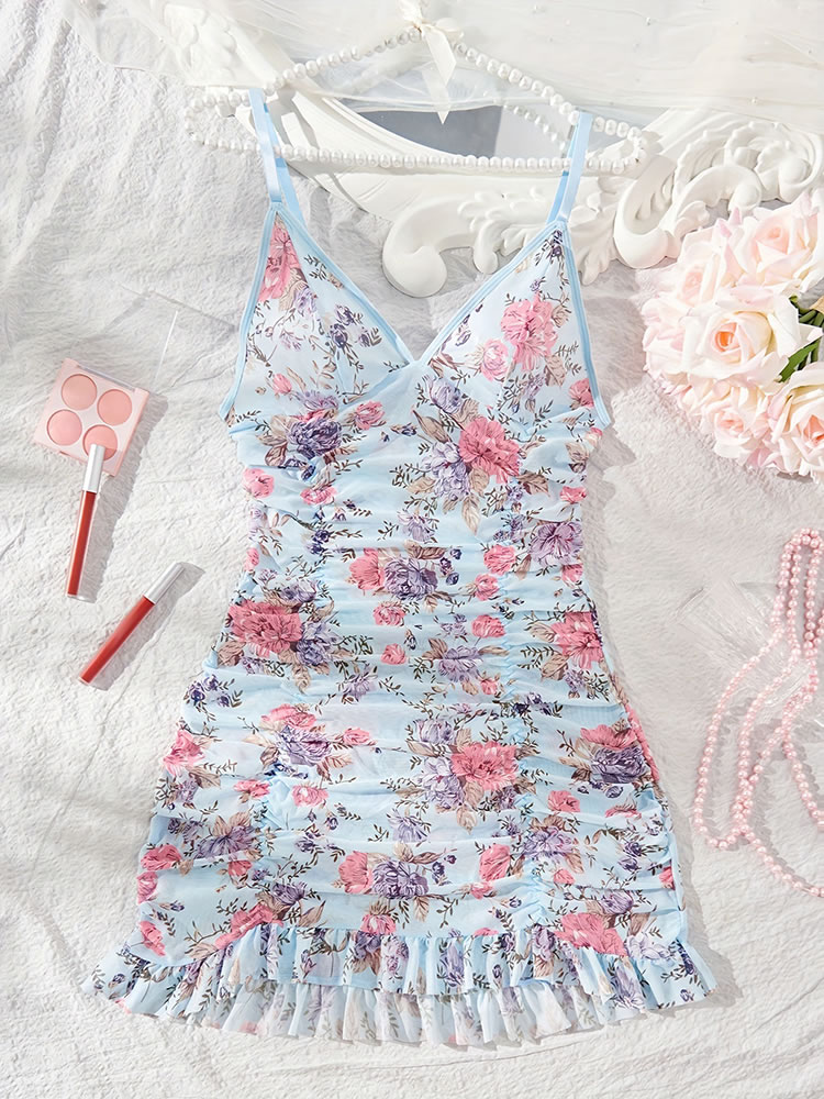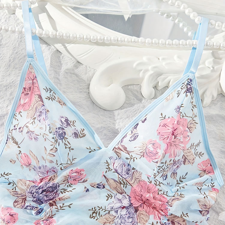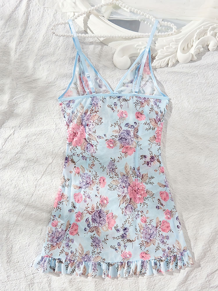 Enhance your romantic night with this sensual babydoll set, featuring soft triangle cups, delicate adjustable spaghetti straps, and a sheer floral mesh skirt with a charming ruffled hem. This flirty ensemble is designed to captivate, adding a touch of elegance and allure to your evening. The perfect balance of comfort and seduction. Get ready to make unforgettable memories in this alluring outfit.