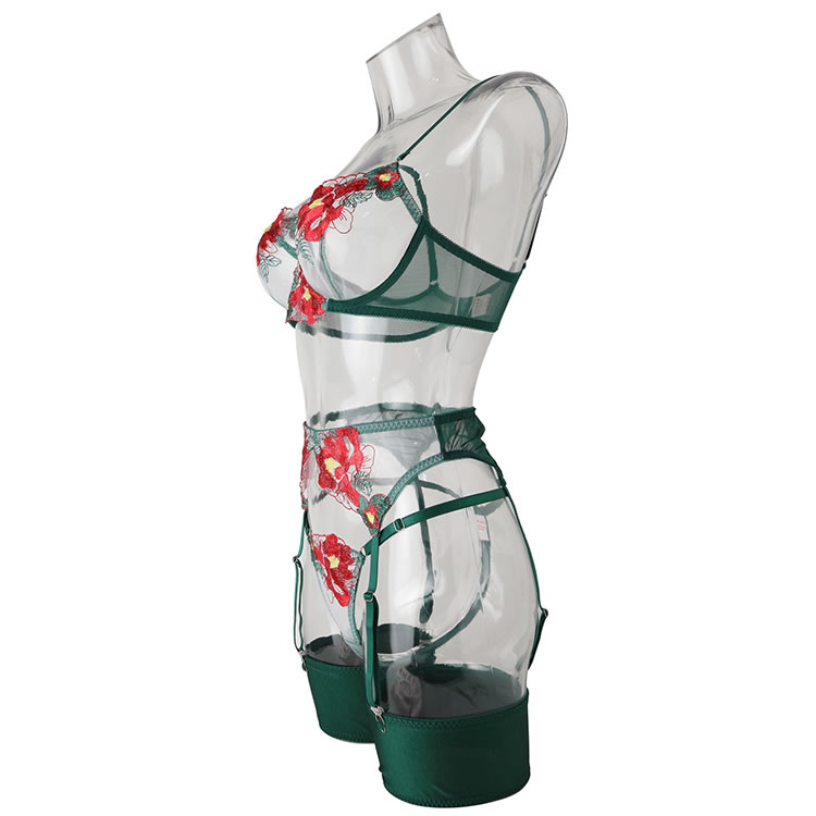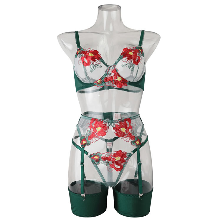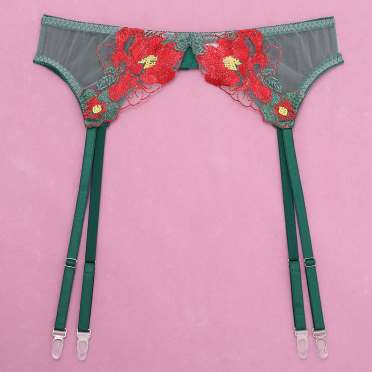 Make your boudoir blossom with this sexy mesh bra set featuring sheer underwire cups with colorful floral embroidery, adjustable spaghetti straps, a hook and eye back closure, a garter belt with a back hook closure and adjustable garter straps, wraparound leg garters, and a matching thong panty.
