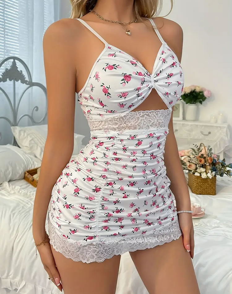 Indulge in the romantic charm of this floral lace lingerie set. The bralette features a deep V-neckline with a gathered front, adorned with delicate pink floral prints on a white background. The soft cups provide support and shape, while the adjustable straps ensure a comfortable fit. The matching high-waisted skirt complements the set with its ruched design and intricate lace trim at the waist and hem, adding a touch of elegance and femininity. Perfect for both intimate moments and special occasions.