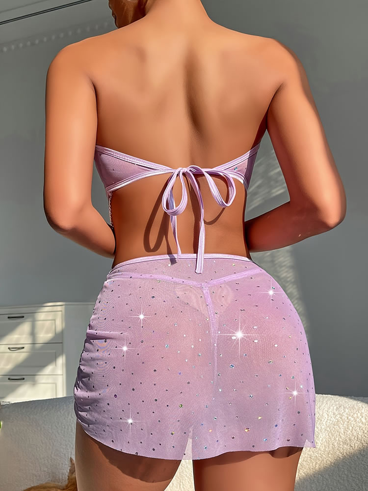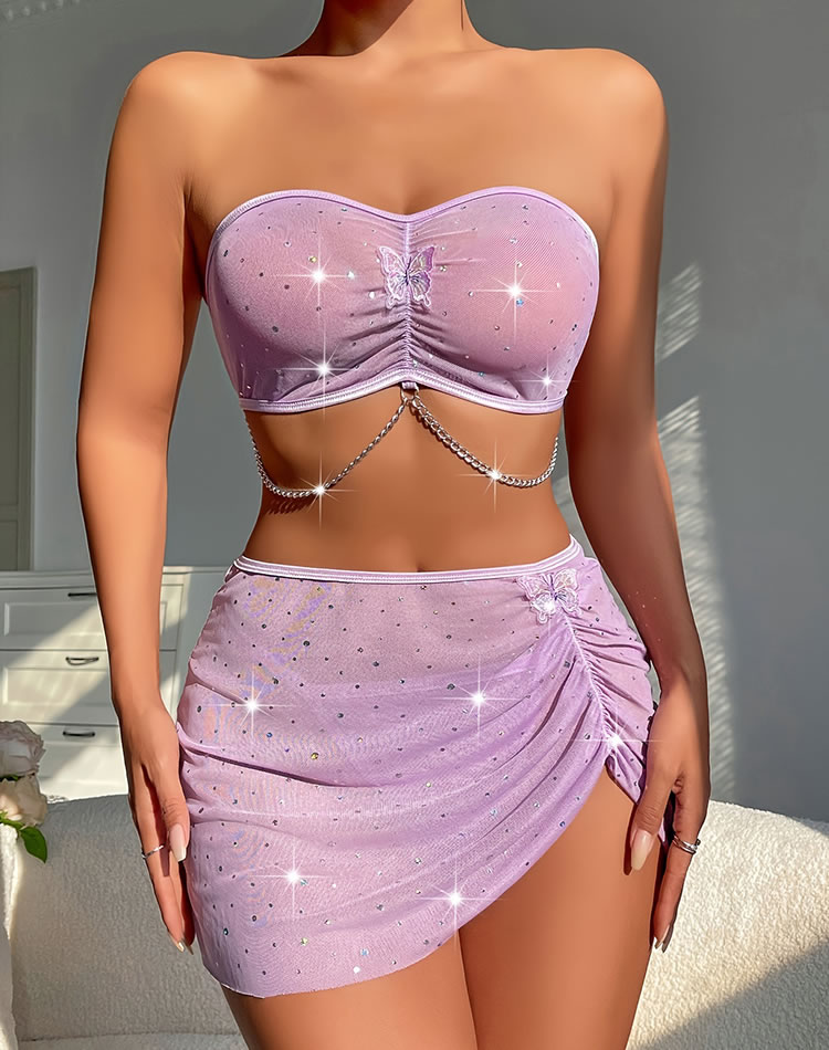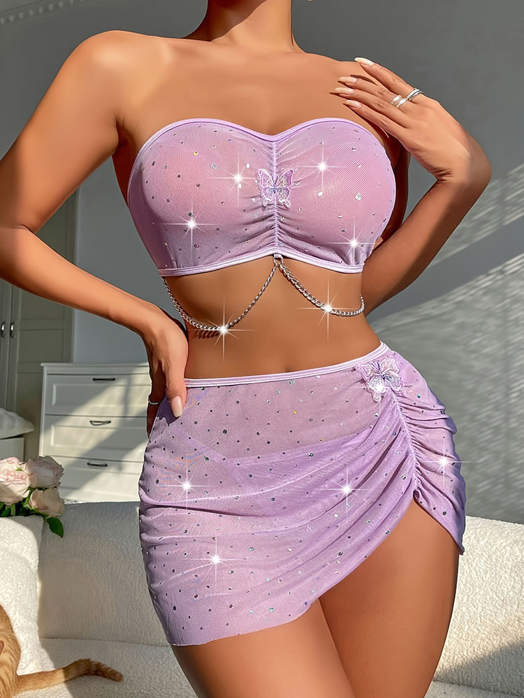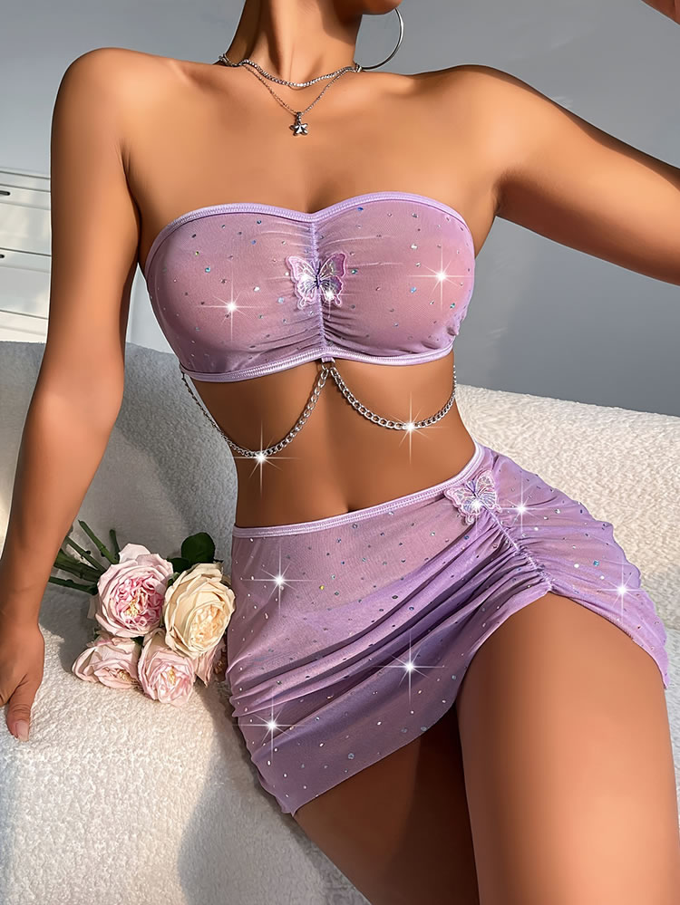Indulge in the glamorous charm of this lilac butterfly lingerie set. The strapless bralette features a sweetheart neckline with intricate butterfly embellishments and sparkling rhinestones, providing a blend of elegance and modern edge. The ruched design adds texture and shape, while the chain detail enhances the overall allure. The matching high-waisted skirt complements the set with its sheer mesh fabric and asymmetrical hem, adorned with delicate butterfly accents for an added touch of glamorous . Perfect for both intimate moments and special occasions.