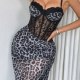 This striking maxi dress features a cool-toned gray leopard print paired with a black lace corset-style bodice that adds texture and contrast. The fitted waist flows into a floor-length skirt, allowing for adjustable coverage and fluid movement. Thin adjustable straps ensure comfort, while the sheer mesh panels at the hips enhance the sensual silhouette. Ideal for evening events or bold fashion statements.
