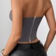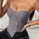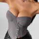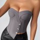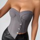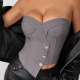 Redefine your style with this sleek, modern grey strapless bustier. Featuring a unique asymmetrical front closure adorned with sparkling crystal-like buttons, this top adds a touch of glamour to any outfit. The structured design with molded cups and vertical seaming sculpts the torso for a flattering, hourglass silhouette. Paired here with high-waisted black pants, it's the perfect statement piece for creating a chic and confident look for evenings out or special occasions.