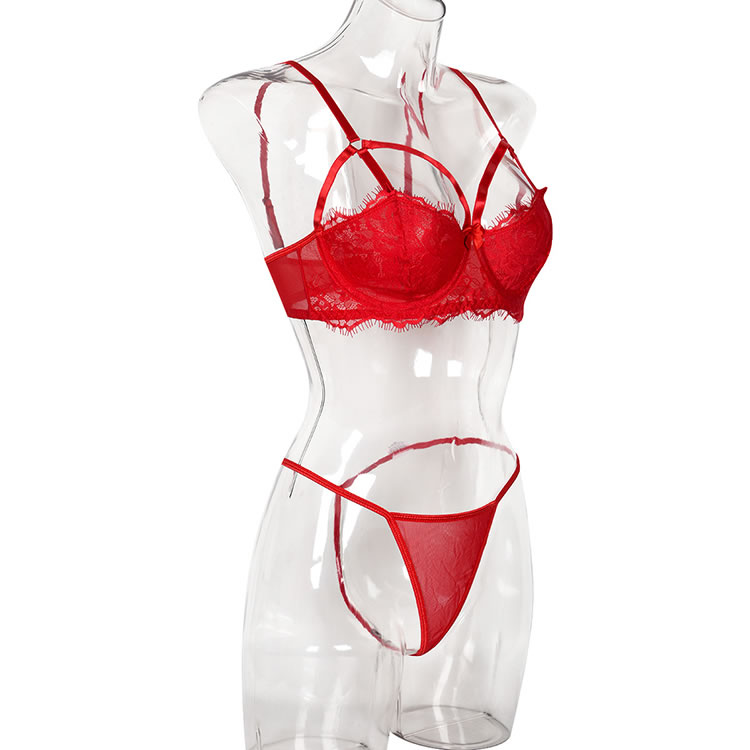 Give your lover the perfect gift (you) in this sexy red bra set featuring soft lace underwire cups with strappy detailing, a satin bow accent, adjustable spaghetti straps, a hook and eye back closure, and a matching low rise panty with a thong cut back.