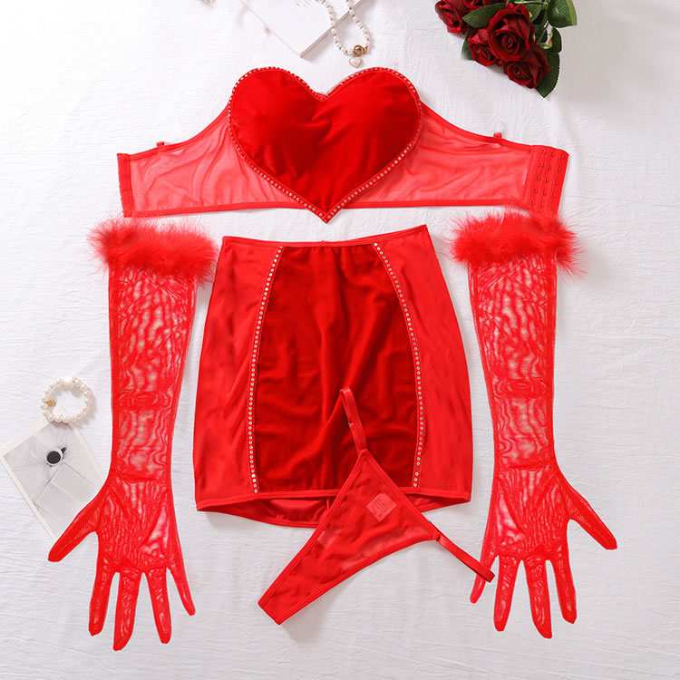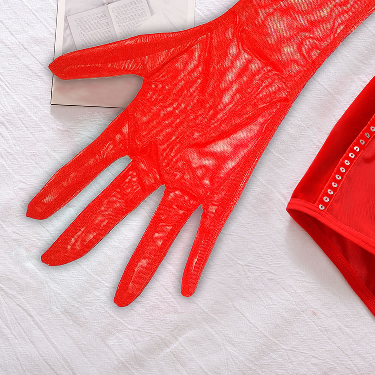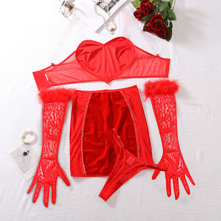 Master the art of seduction in this alluring red bra set featuring solid cups, a hook and eye back closure, a flirty matching mini skirt, a coordinating thong panty, and sleek gloves.