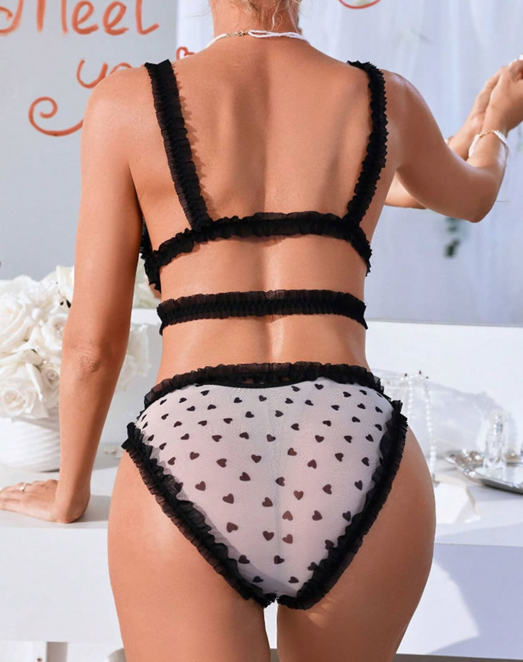 Captivate your lover’s attention with this alluring bra set. It features sheer mesh triangle cups, ruffled straps, and a criss-cross underbust detail. Paired with a matching cheeky panty, this set combines playful charm with irresistible allure.