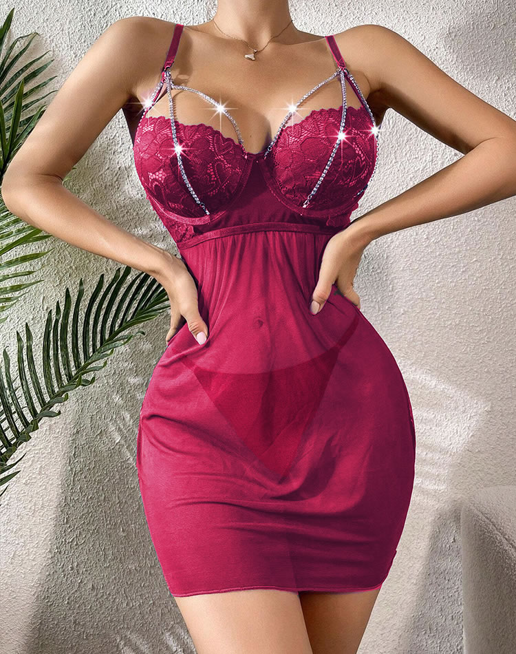 Love style and comfort? Don't choose just one in this sexy babydoll set featuring sheer lace cups with bust framing rhinestone chains, adjustable spaghetti straps, a hook and eye back closure with a keyhole, a sheer mesh bodice, and a matching g-string panty.