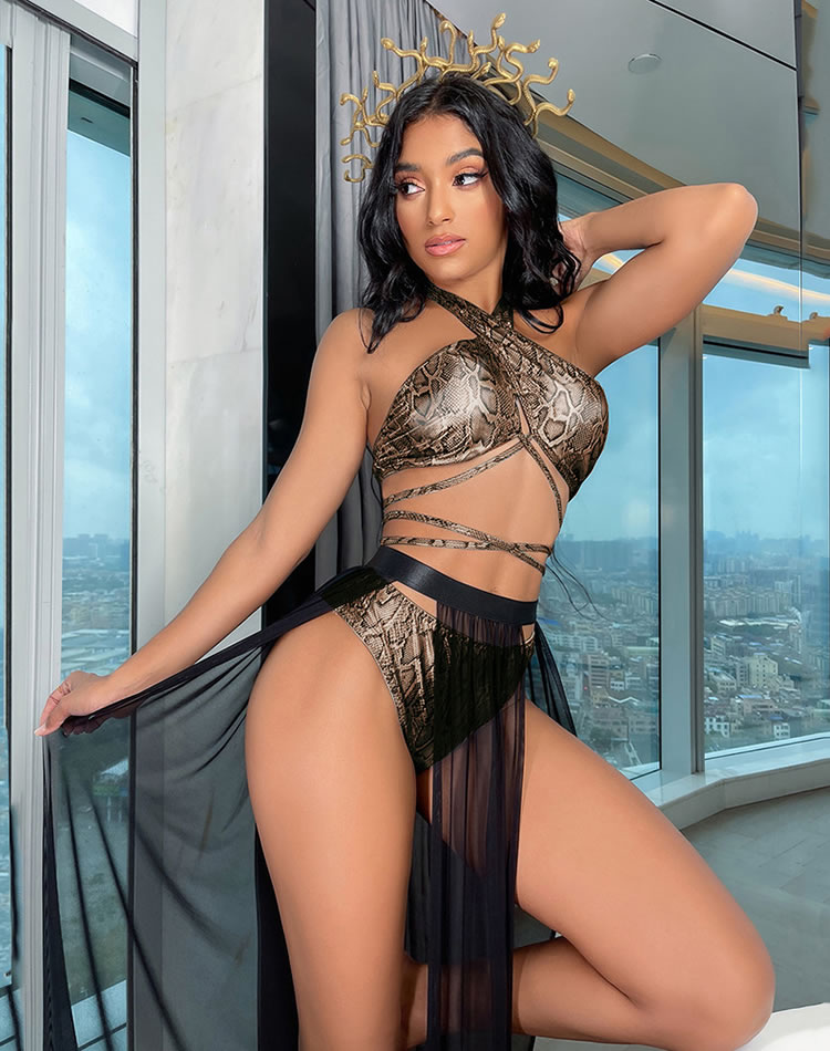 Step into a world of drama and allure with this striking lingerie set that merges fashion and fantasy. The asymmetrical snake printed top is designed with strategic cutouts and a halter-style neck, creating a powerful visual impact. The matching high-waisted briefs are layered with a floor-length sheer skirt that flows with every step. It’s ideal for Halloween, costume parties, or roleplay where confidence meets style.