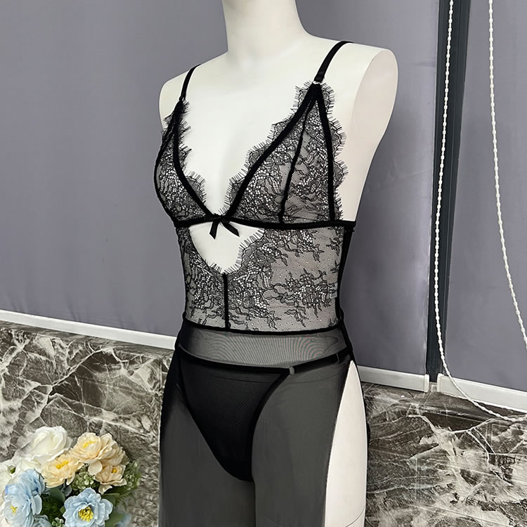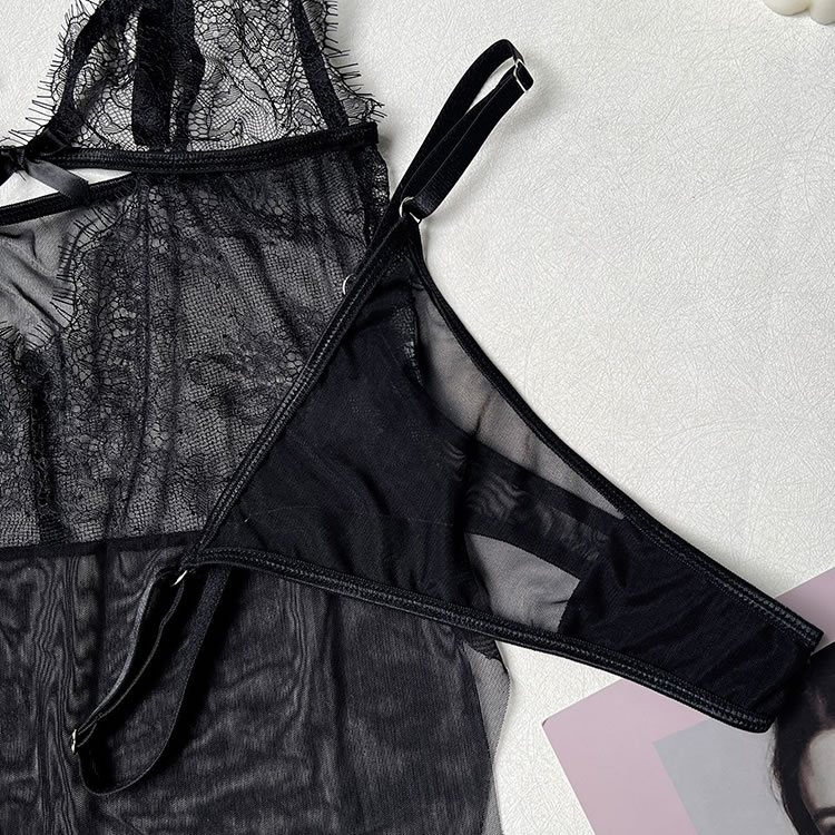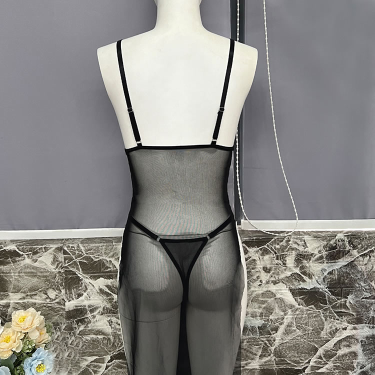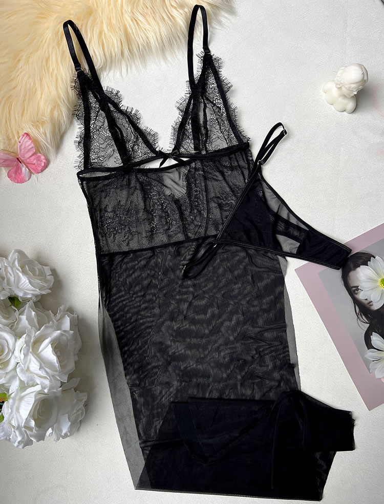 This bold black lingerie gown combines a lace-trimmed top with a deep V-neckline and crisscross detailing, offering both structure and allure. The sheer mesh extends into a long, high-slit skirt that flows gracefully with movement. Designed with thin straps and an open back, it's crafted to highlight the silhouette with confidence and style.