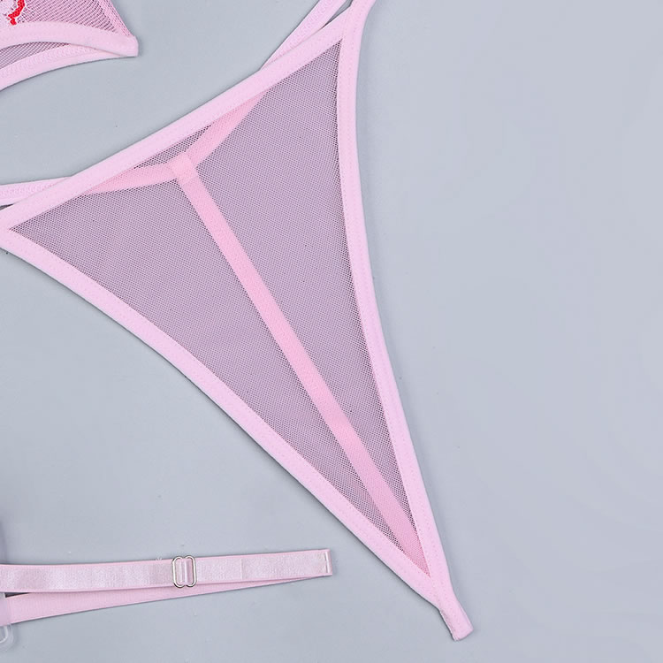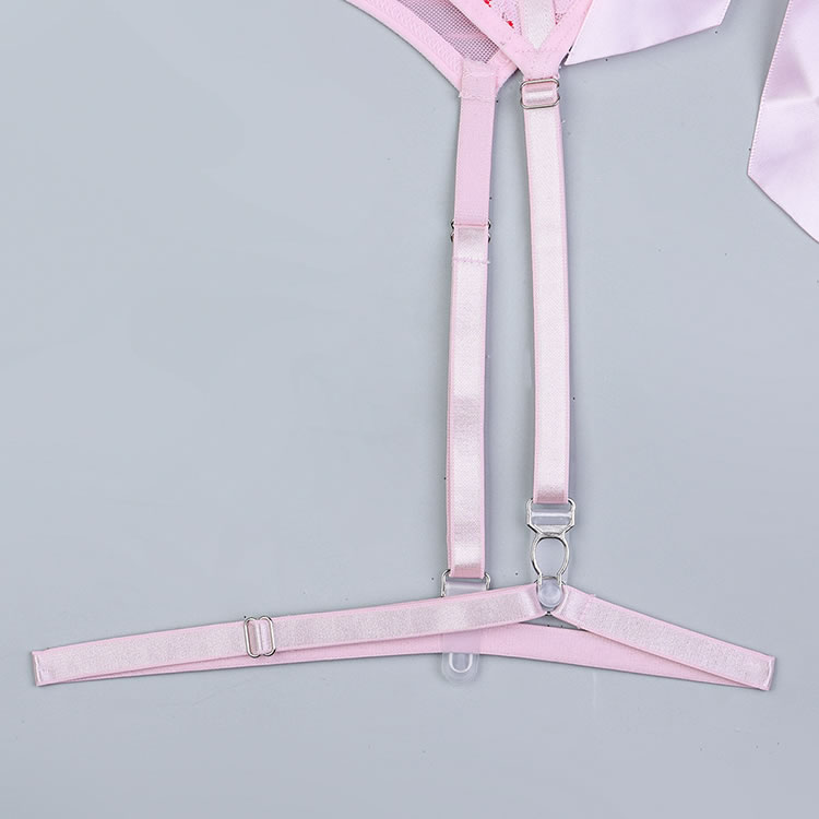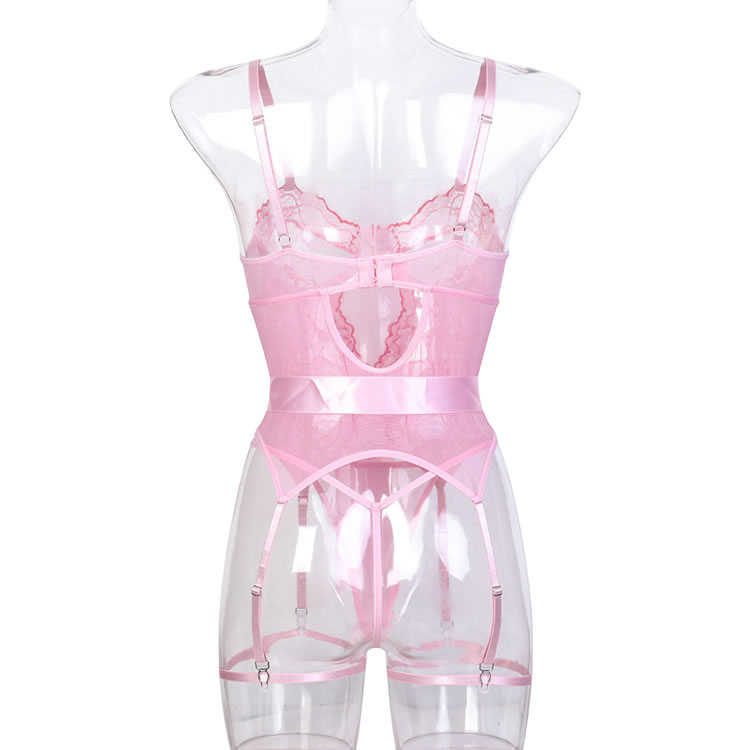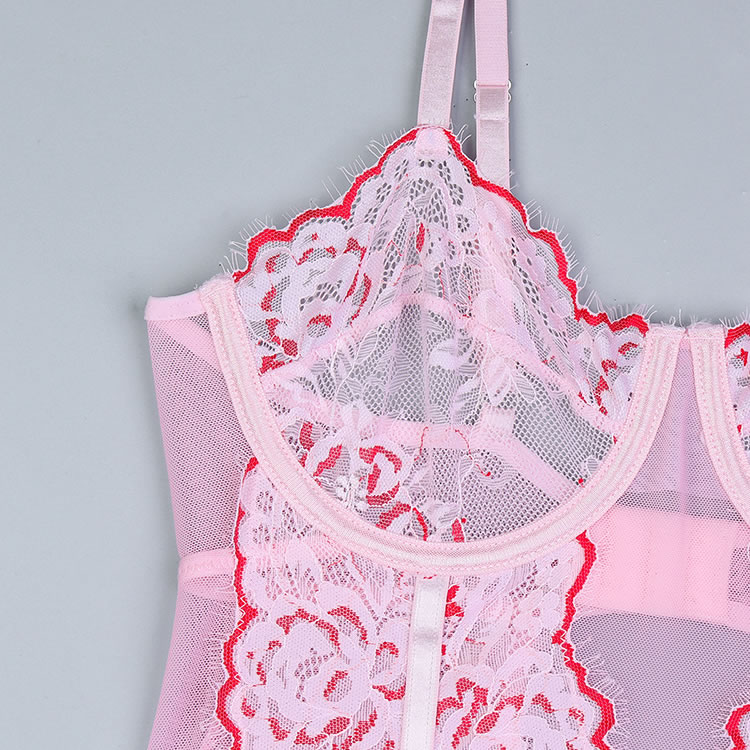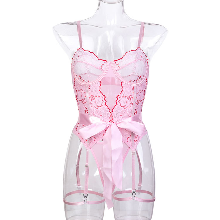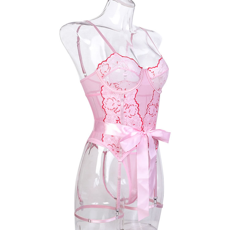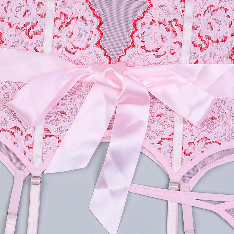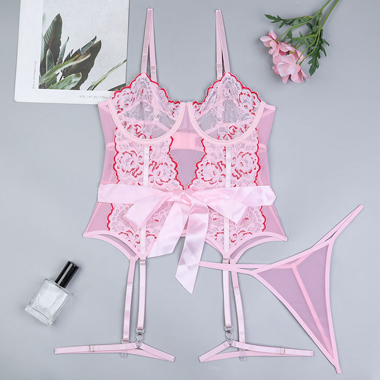 Tempt and tease in this exclusive bustier set featuring sheer lace underwire cups, adjustable spaghetti straps, a hook and eye back closure with a keyhole opening, sheer lace bodice panels, a pink satin waistband, adjustable garter straps with wraparound leg garters, and a matching thong.
