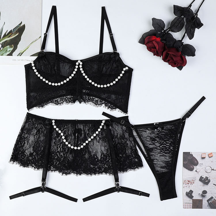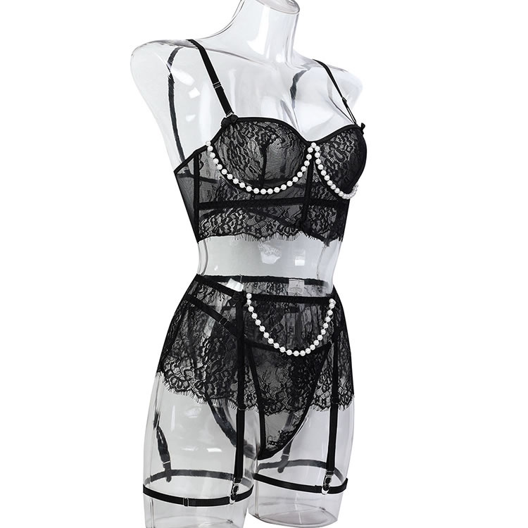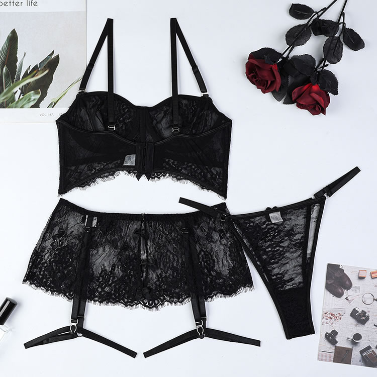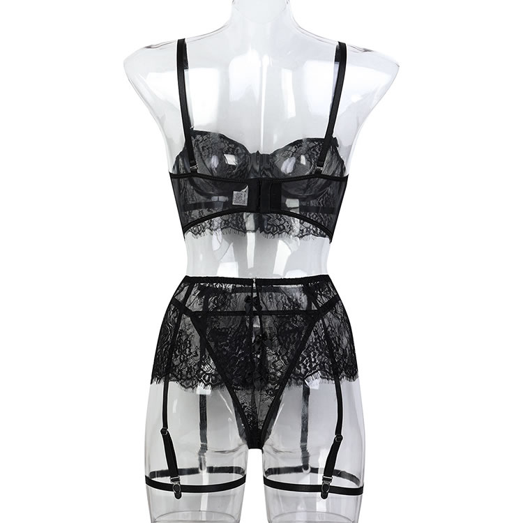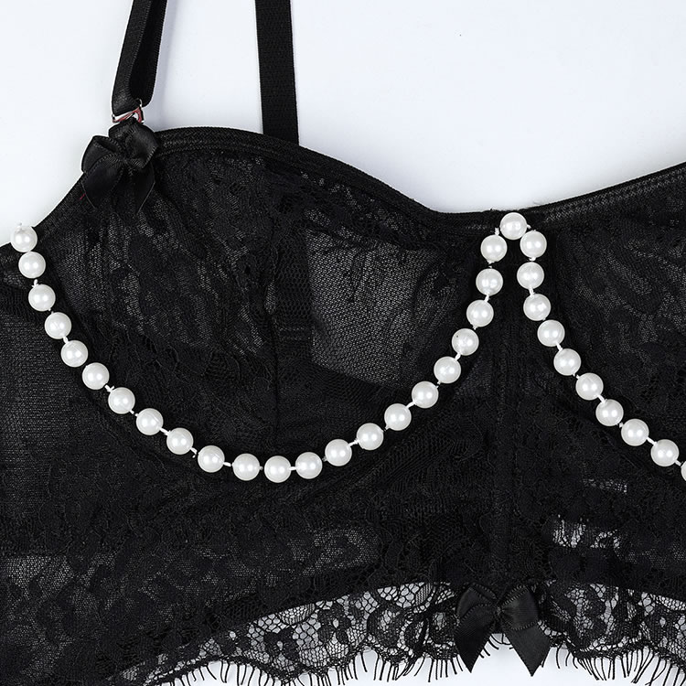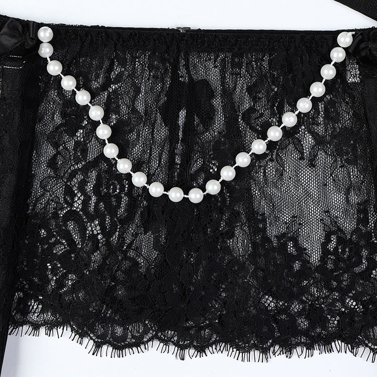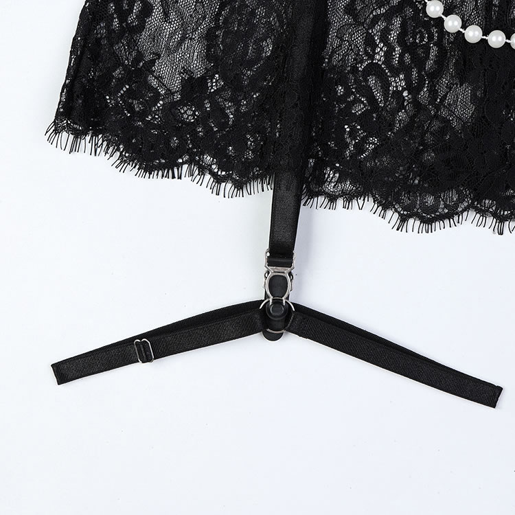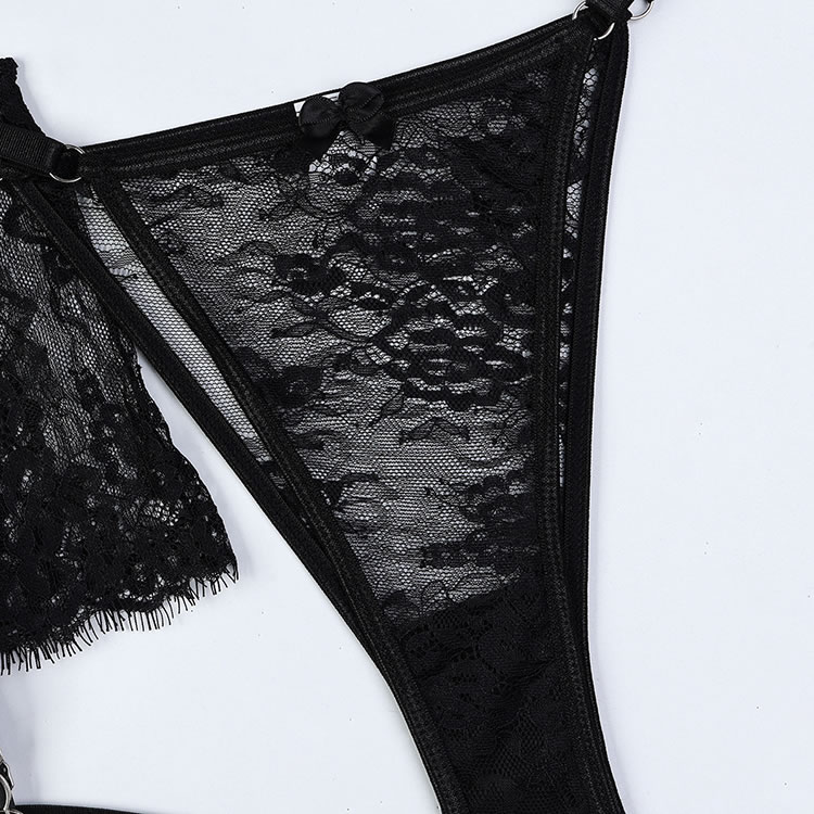 Add a touch of contrast and playfulness to your lingerie collection with this enchanting bra set. Featuring sheer lace underwire cups and adjustable spaghetti straps, it combines elegance with flirtation. The hook and eye back closure ensures a secure fit, while the matching high-waisted garter belt with adjustable garter straps and wraparound leg garters adds a daring flair. Complete with a matching thong panty, this set is perfect for making a bold statement and embracing your playful side.