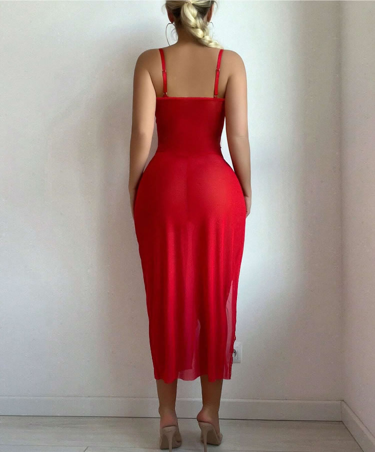 Turn up the heat in this enticing lingerie gown featuring sheer lace cups with satin bow details, adjustable spaghetti straps, and a lace and mesh underbust band. The sheer mesh skirt with a lace trim and sultry high side slit add a touch of drama, while the matching G-string completes this irresistible set. Perfect for making a memorable impression.