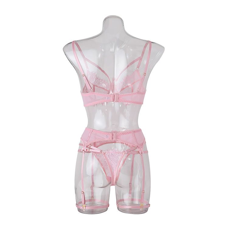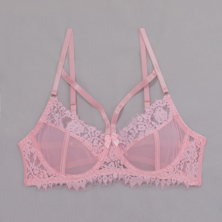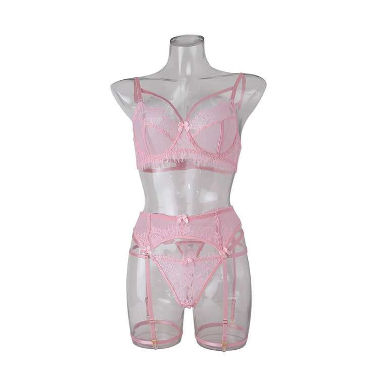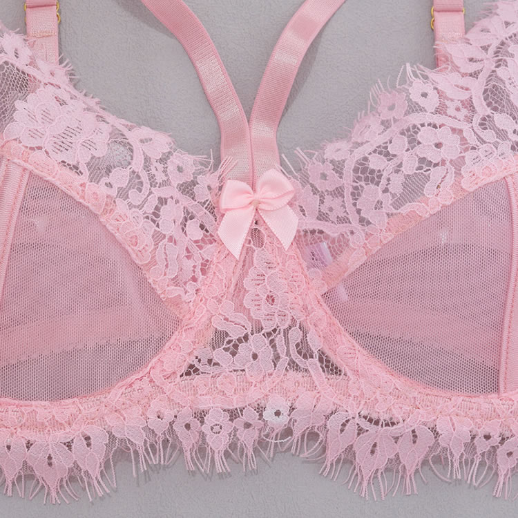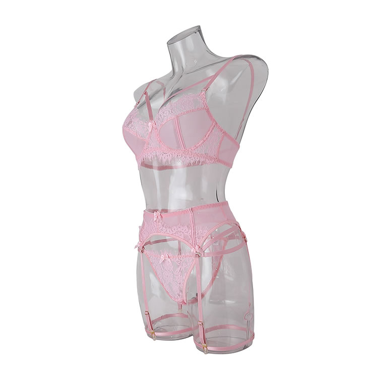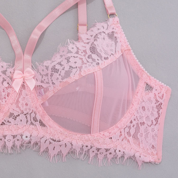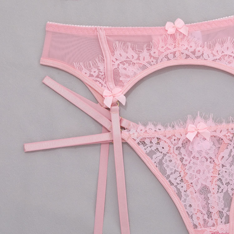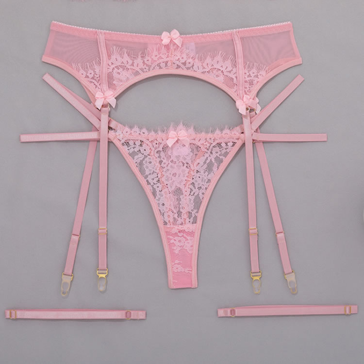 Communicate wordlessly to your sweetie that you mean business in the bedroom with this statement bra set featuring sheer mesh cups with an eyelash lace trim, adjustable spaghetti straps, a hook and eye back closure, a matching garter belt with adjustable garter straps, wraparound leg garters, and a matching thong panty.