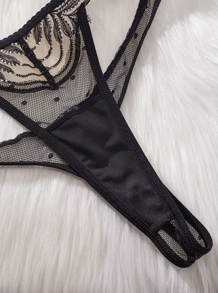 Highlight your gorgeous physique in this sexy bra set featuring sheer lace underwire cups, adjustable spaghetti straps, a hook and eye back closure, a matching high waisted garter belt with a hook and eye back closure, garter straps, wraparound leg garters, and a matching thong panty.