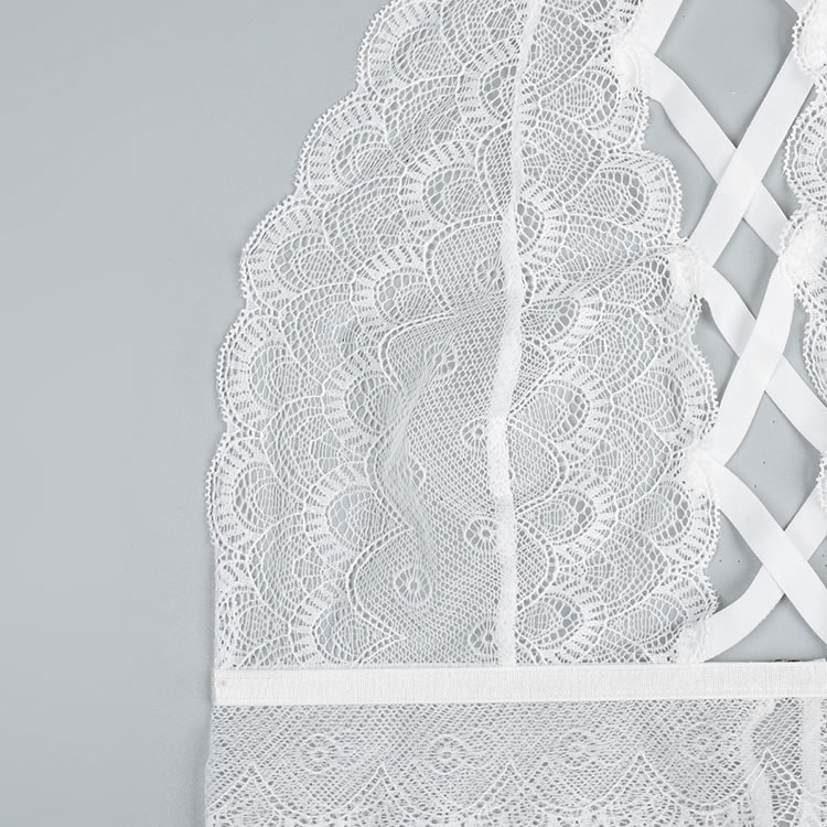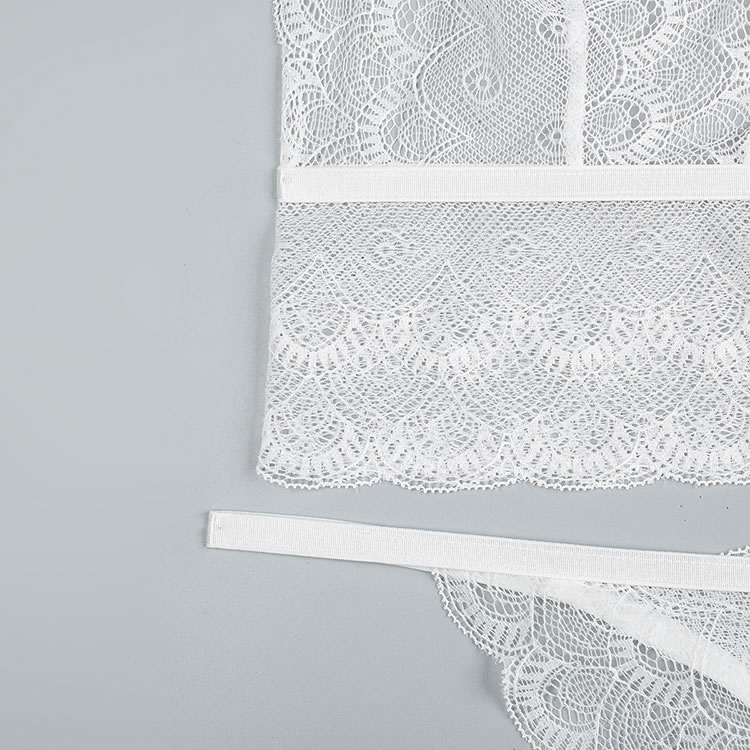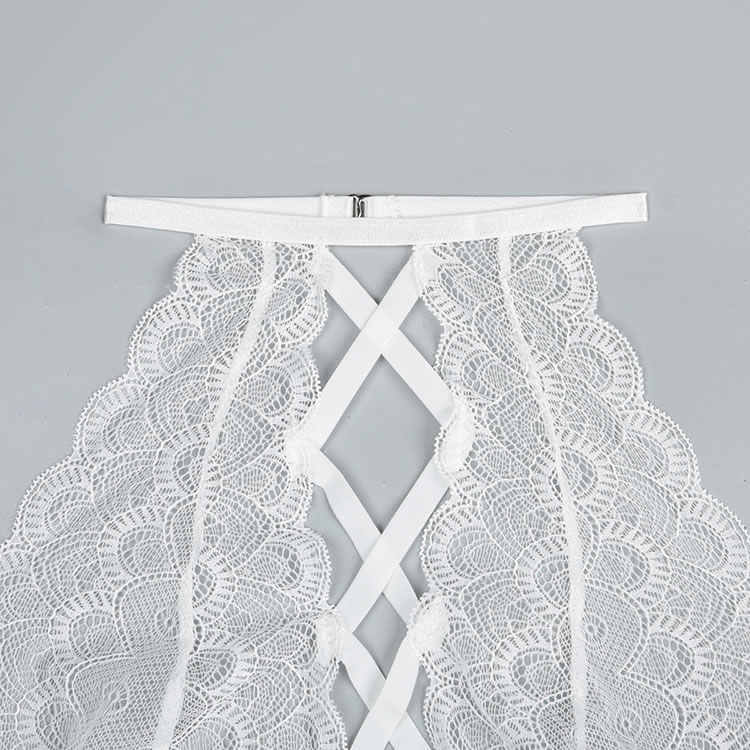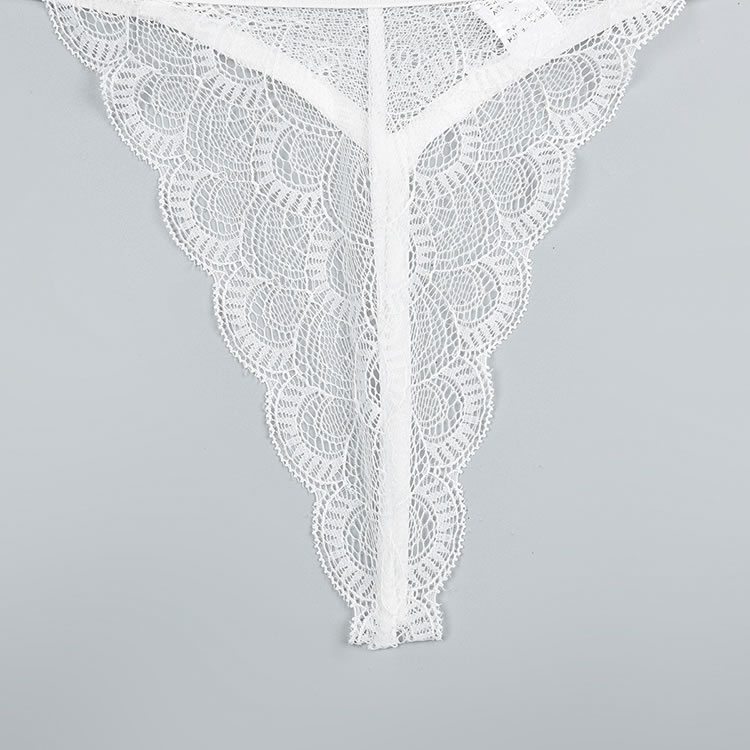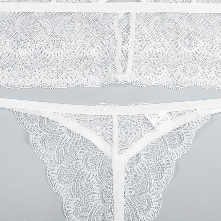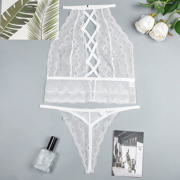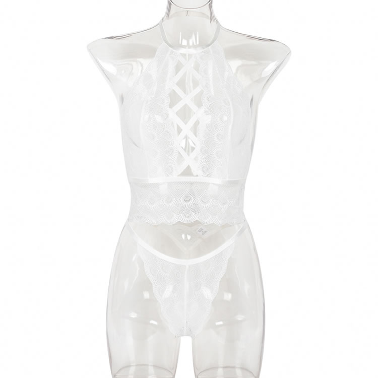 Get it on in this sensual lace bra set featuring sheer lace cups, halter straps, a sheer lace longline underbust band, a hook back closure, and a matching thong panty.