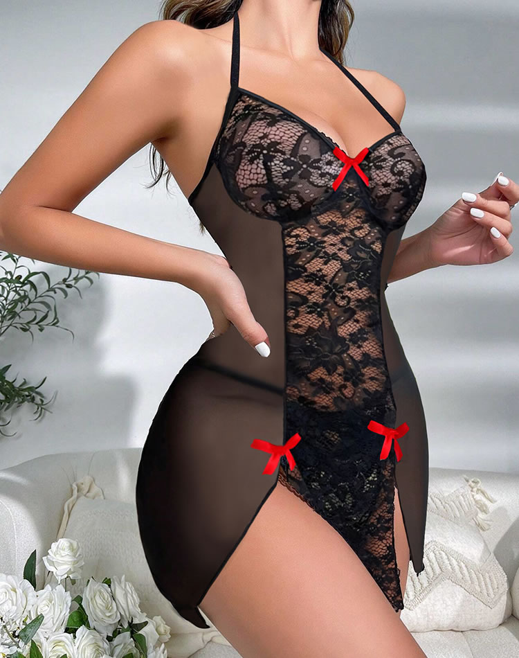 Entice and captivate in this exclusive babydoll set. Available in black, it features a stunning combination of lace and mesh, satin bow detail, halter straps, side slits, and a matching thong panty.