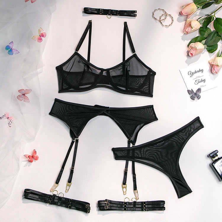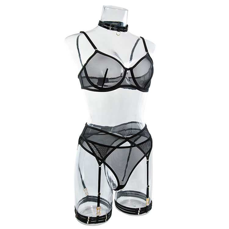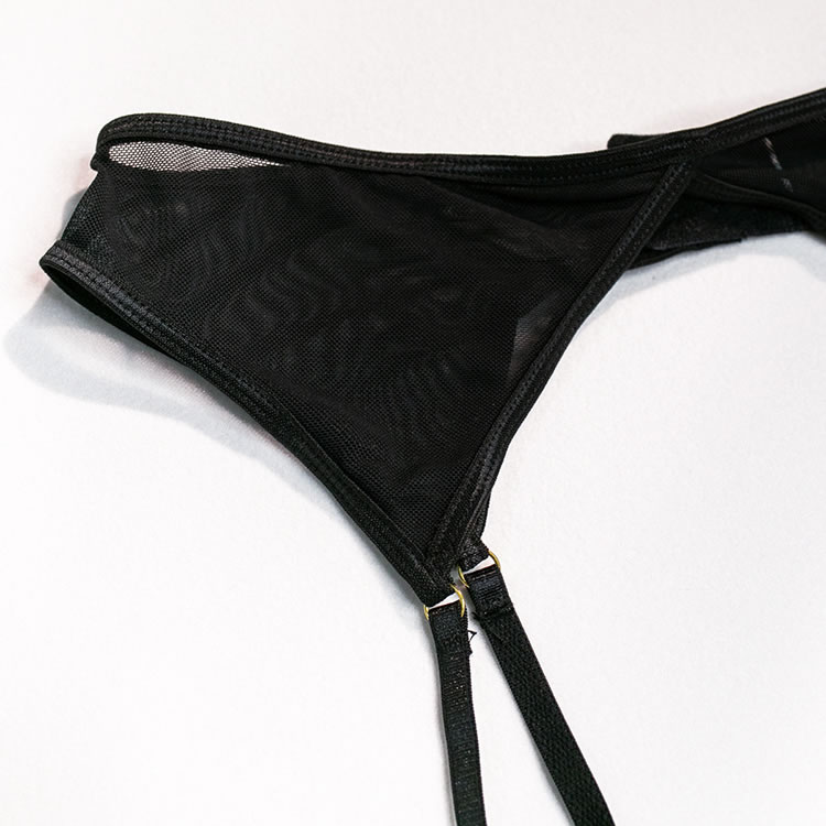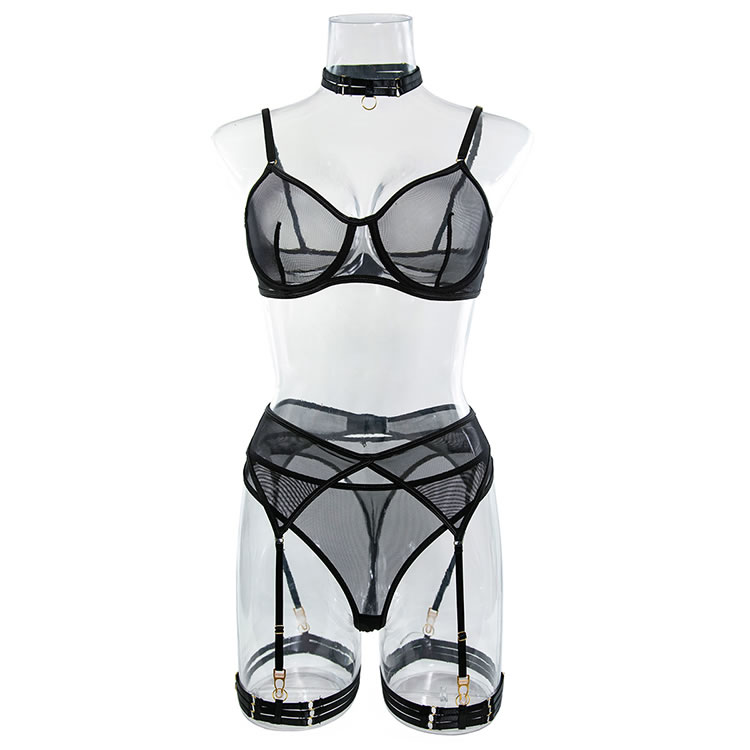 Redefine sexy in this stunning bra set featuring sheer mesh underwire cups, adjustable spaghetti straps, a hook and eye back closure, a matching panty with a cheeky cut back, and a matching high waisted garter belt with a hook and eye back closure, and adjustable garter straps, wraparound leg garters. (Choker included.)