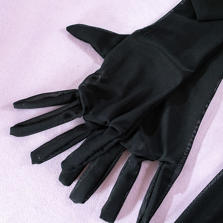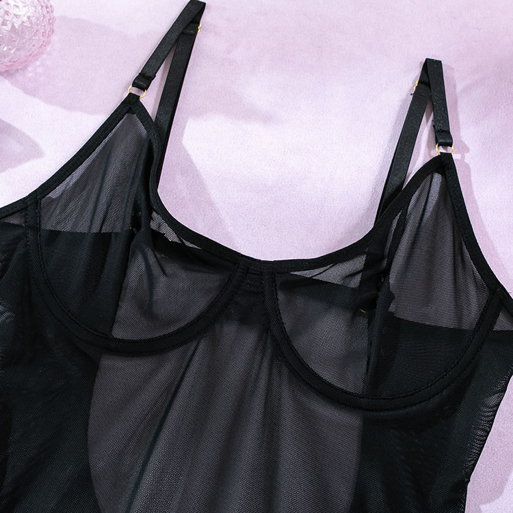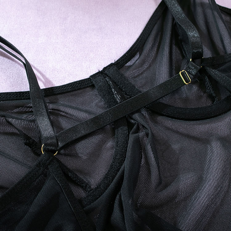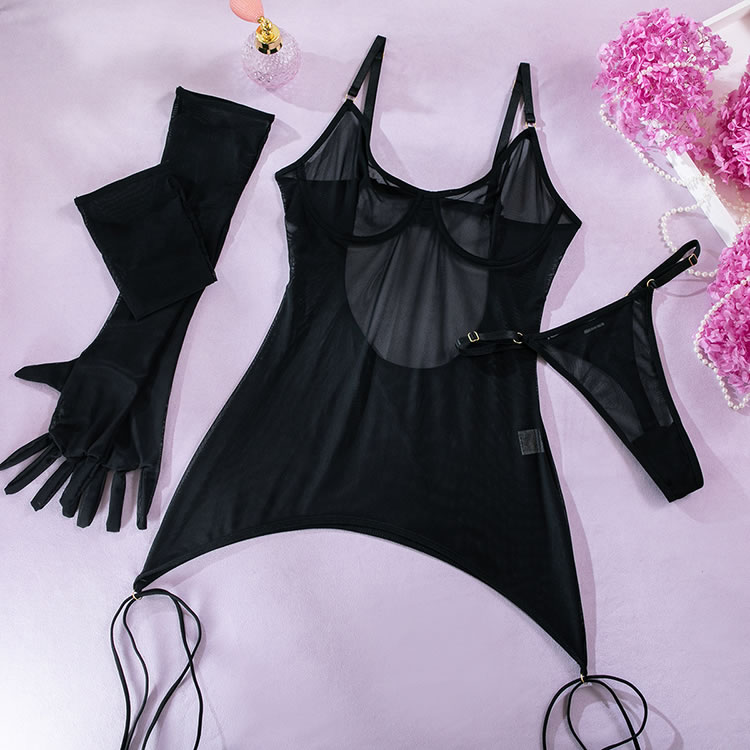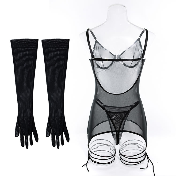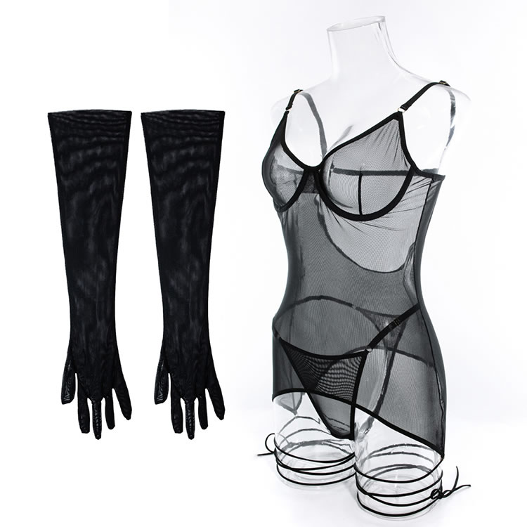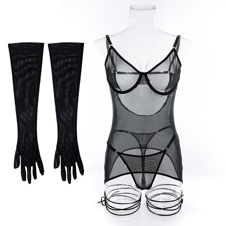 Redefine sexy in this stunning bra set featuring sheer mesh underwire cups, adjustable spaghetti straps, a sheer mesh bodice, garter leg wraps, long gloves, and a matching thong panty.