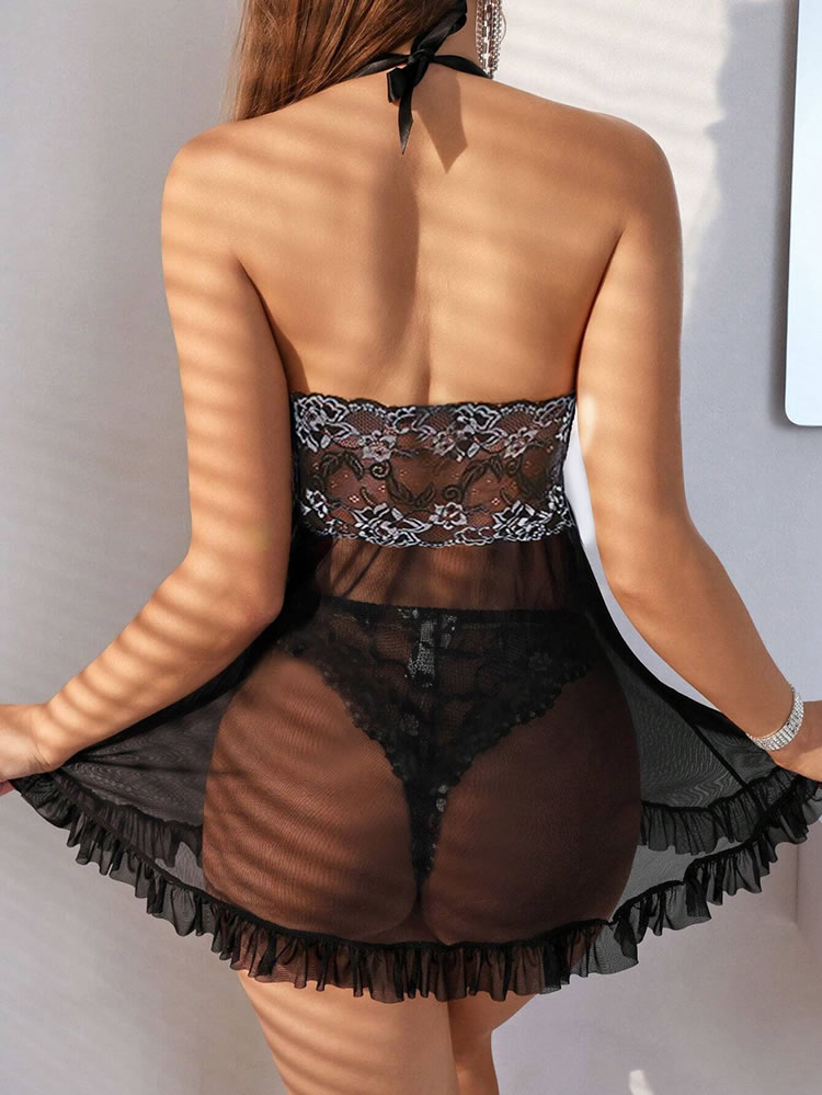 Make a move on your babe in this enticing babydoll set featuring sheer lace cups, a satin bow accent, halter straps, a sheer mesh flyaway skirt with ruffled trim, and a matching panty with a cheeky cut back.