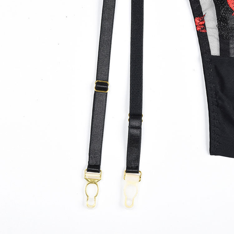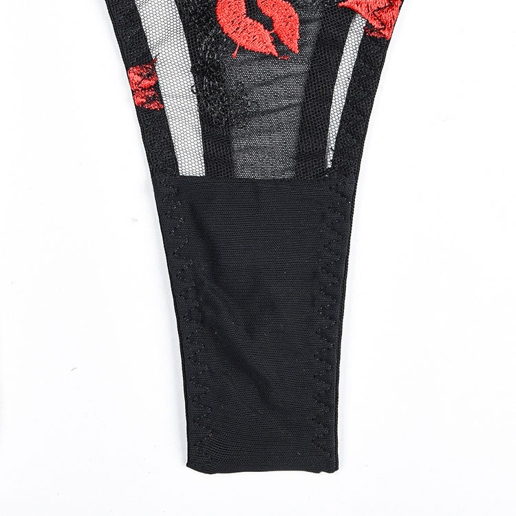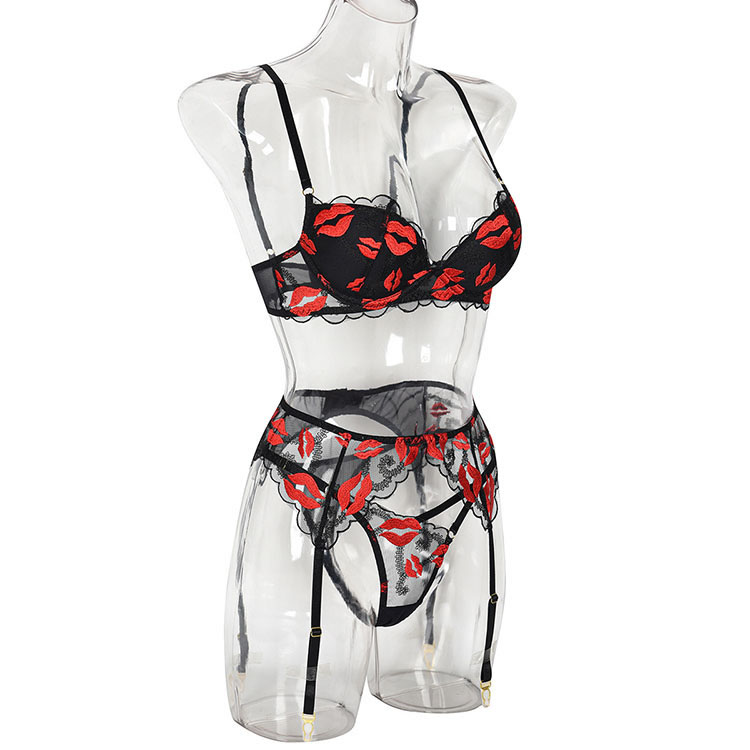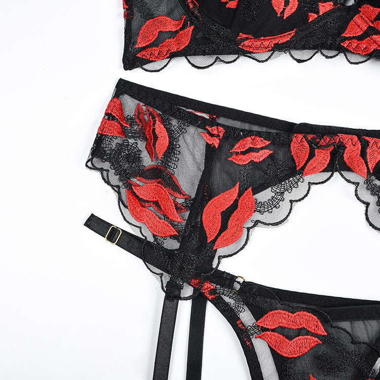 Flaunt your desire for love in this flirty bra set featuring underwire cups with embroidered kiss details, adjustable spaghetti straps, a hook and eye back closure, a matching high waisted garter belt with adjustable garter straps, and a matching panty with a thong cut back.