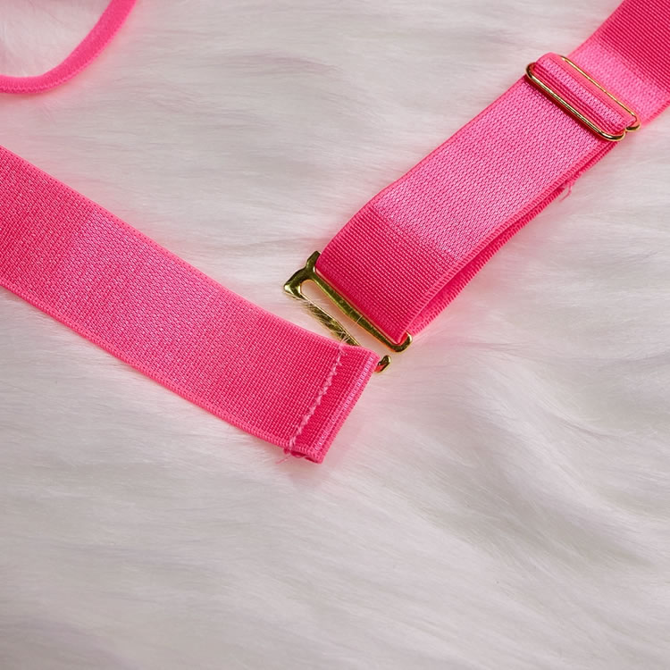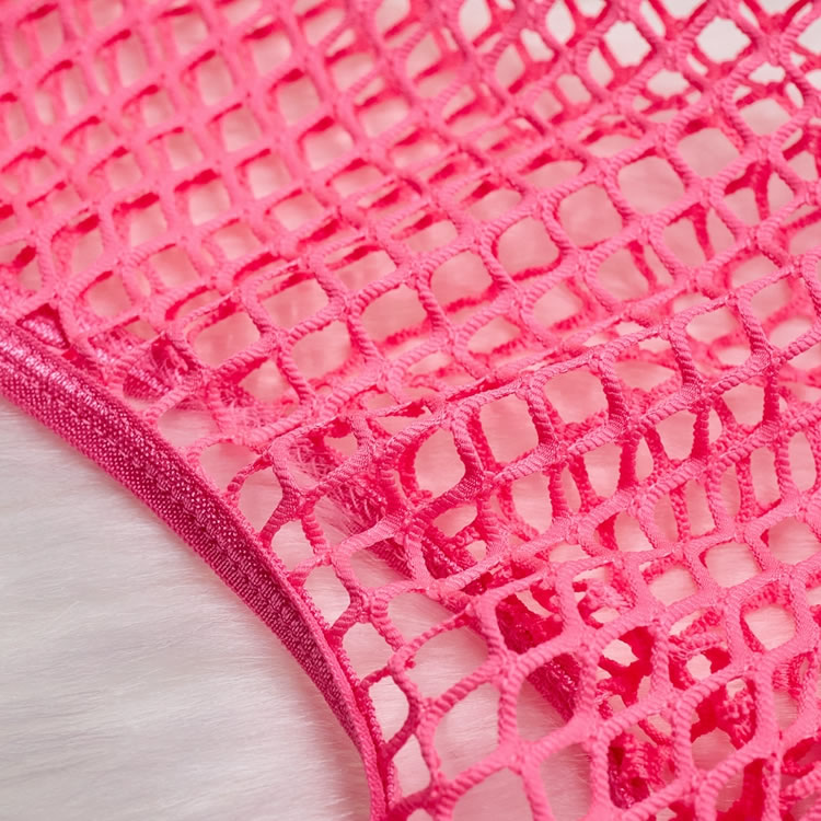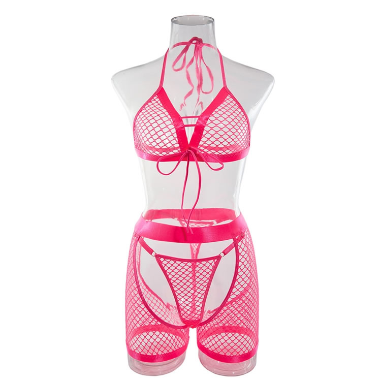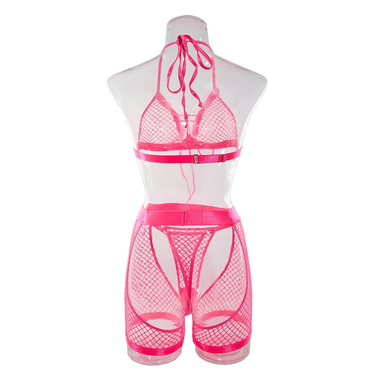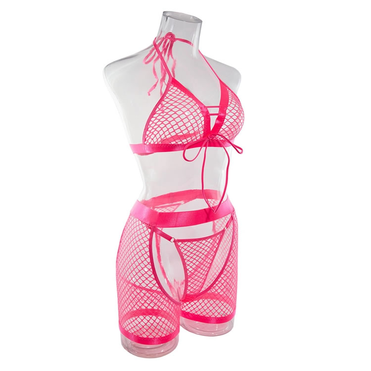 Leave your partner hungry for more in this sultry bra set featuring a fishnet cup with a strappy bust detail, halter straps, a back hook closure, a matching garter belt with wraparound leg garters, and a matching panty with a thong cut back.