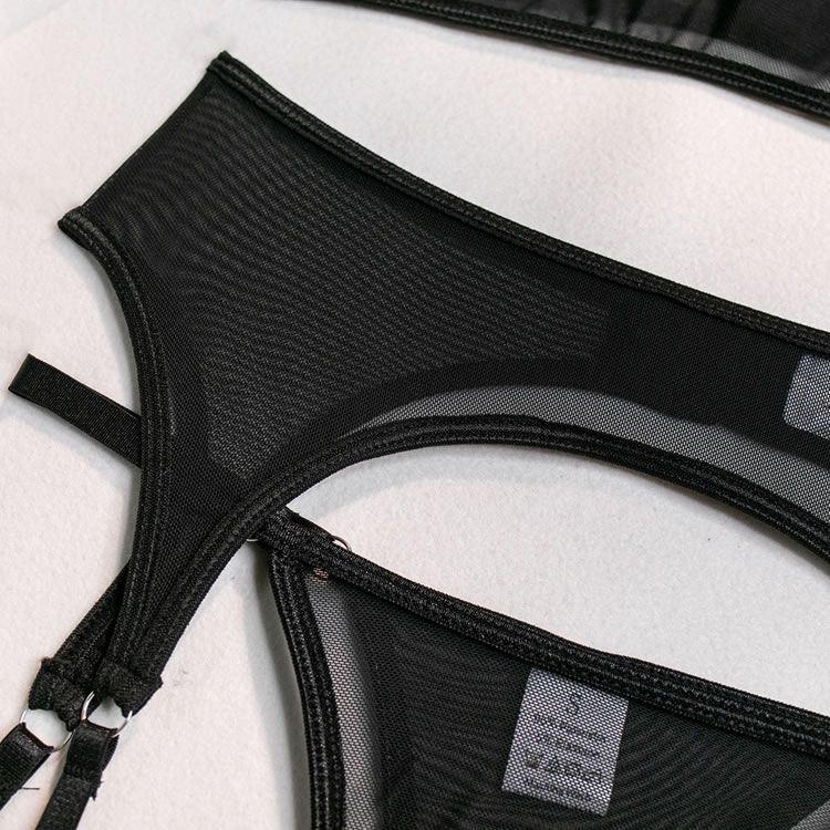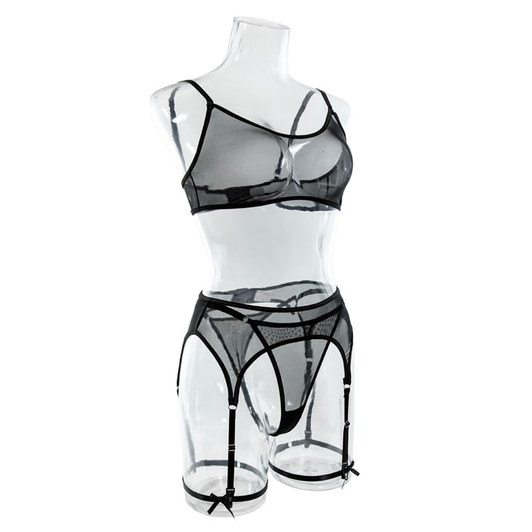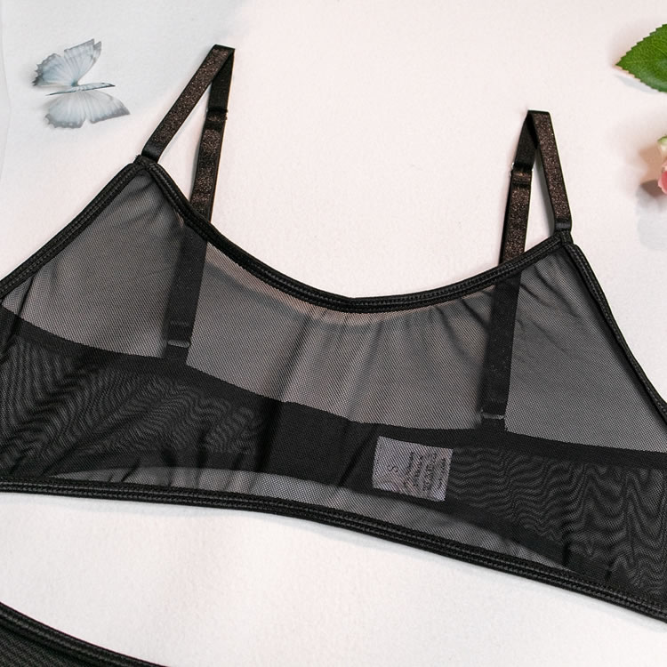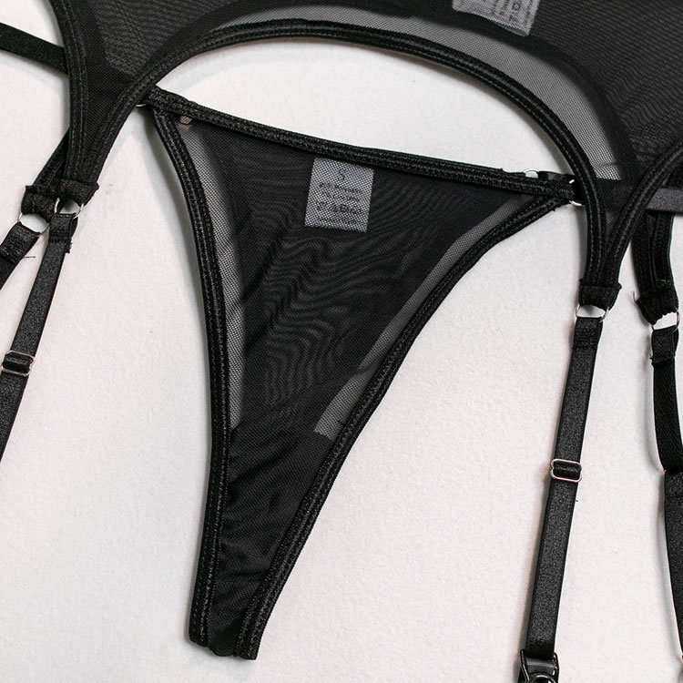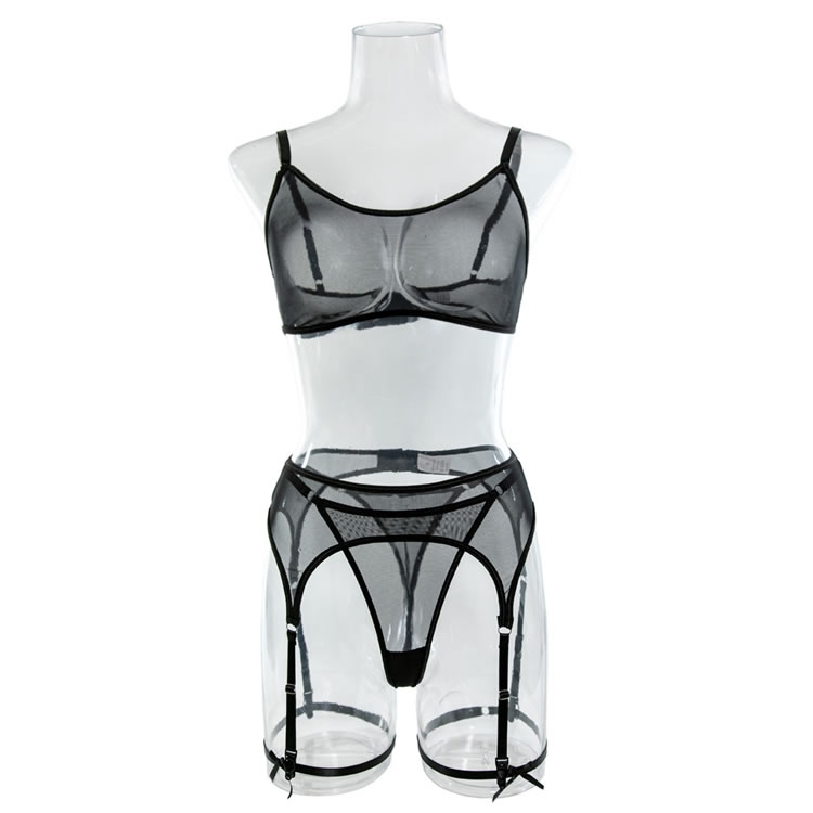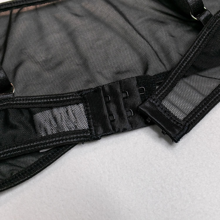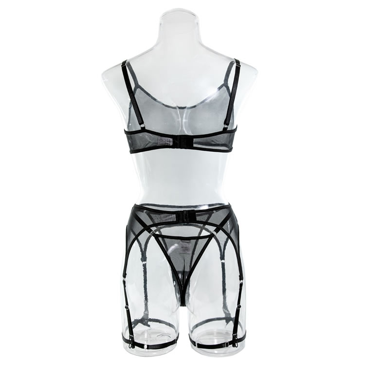 Send a tempting message in this exclusive bra set featuring sheer mesh cups, adjustable spaghetti straps, a hook and eye back closure, a matching high waisted garter belt with adjustable garter straps, wraparound leg garters, and a matching panty.
