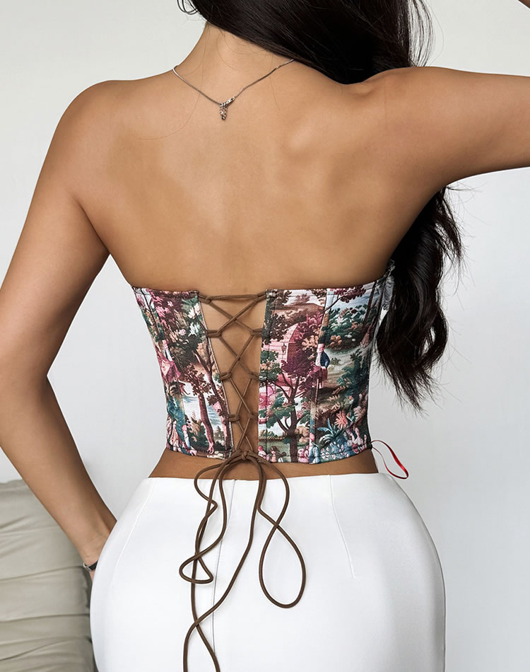 Embrace a touch of nostalgia with this corset adorned with a charming vintage scene print. The intricate design and lace trim add a delicate flair, while the white lacing provides a bold contrast. Perfect for those who appreciate unique and eye-catching fashion pieces, this corset is both stylish and comfortable.