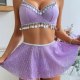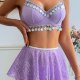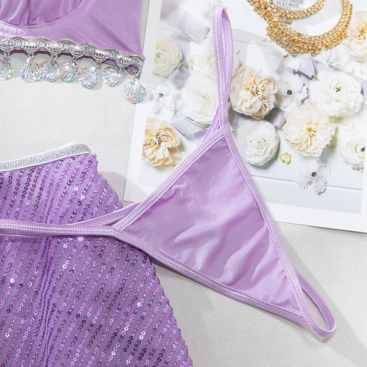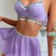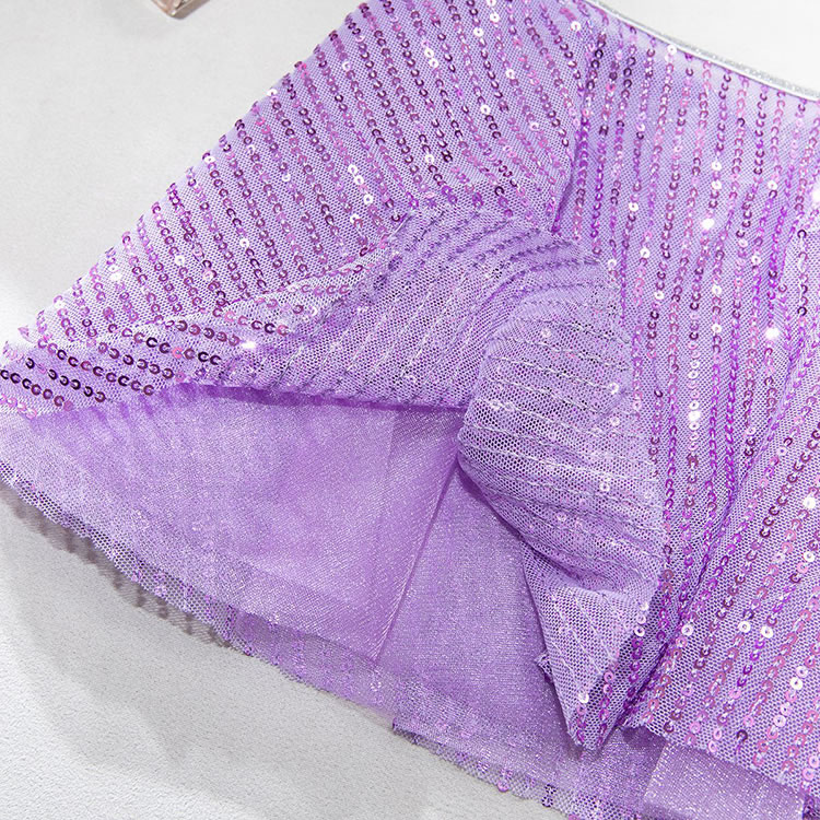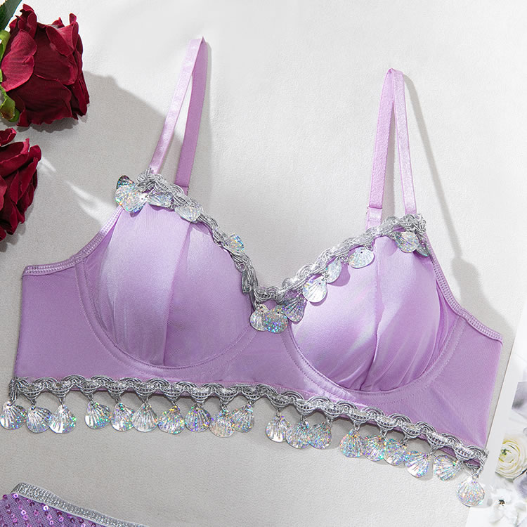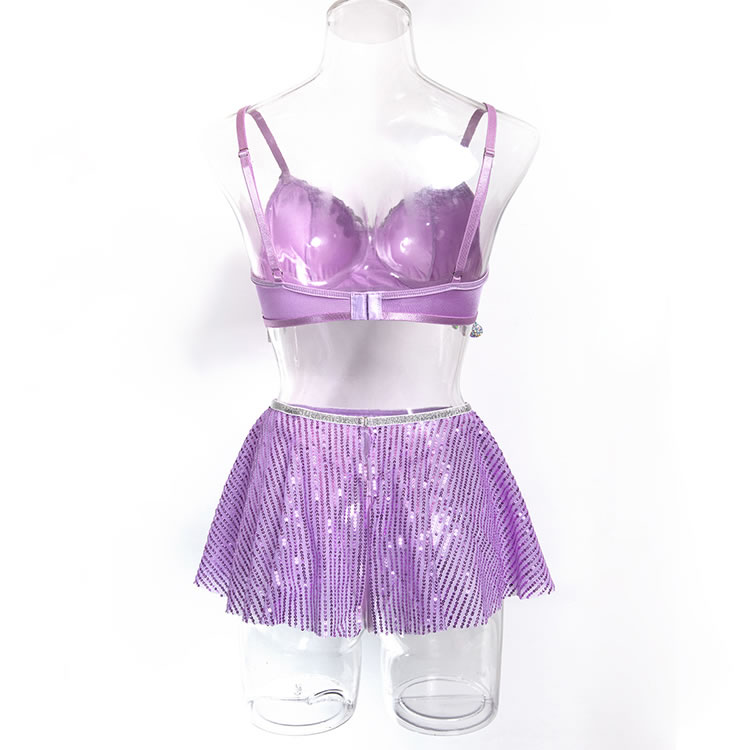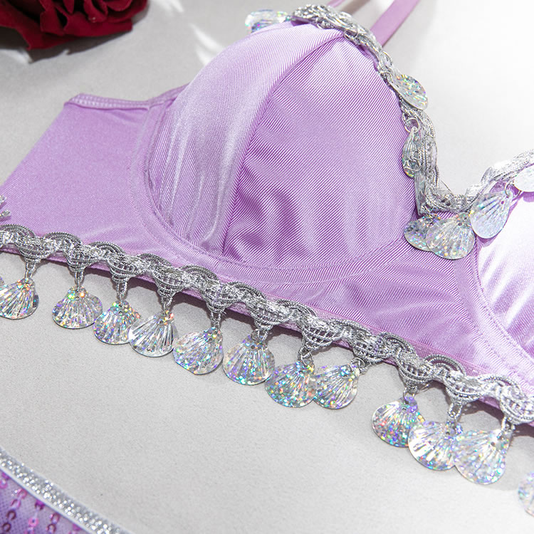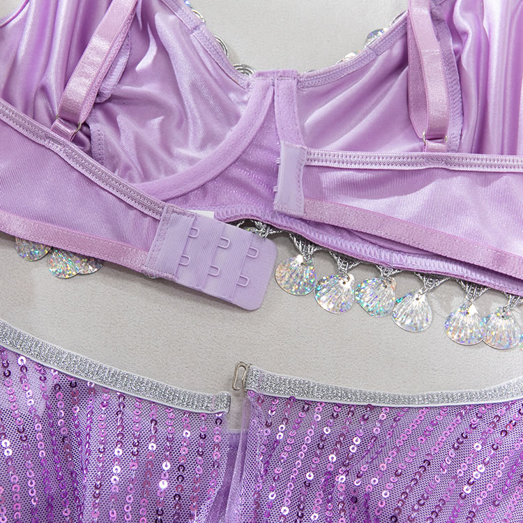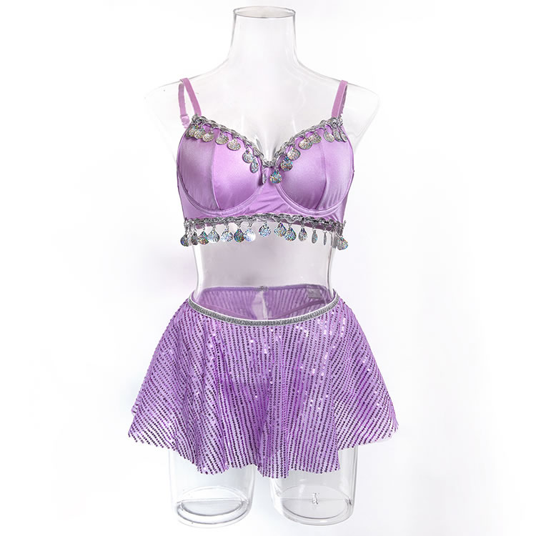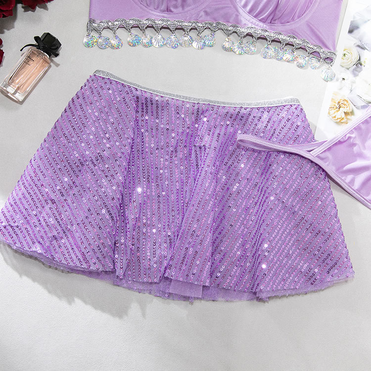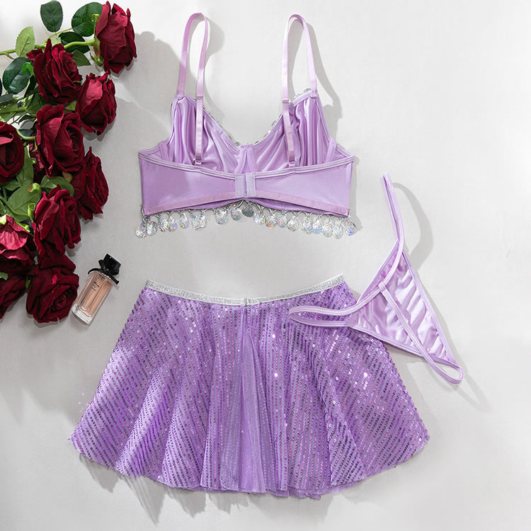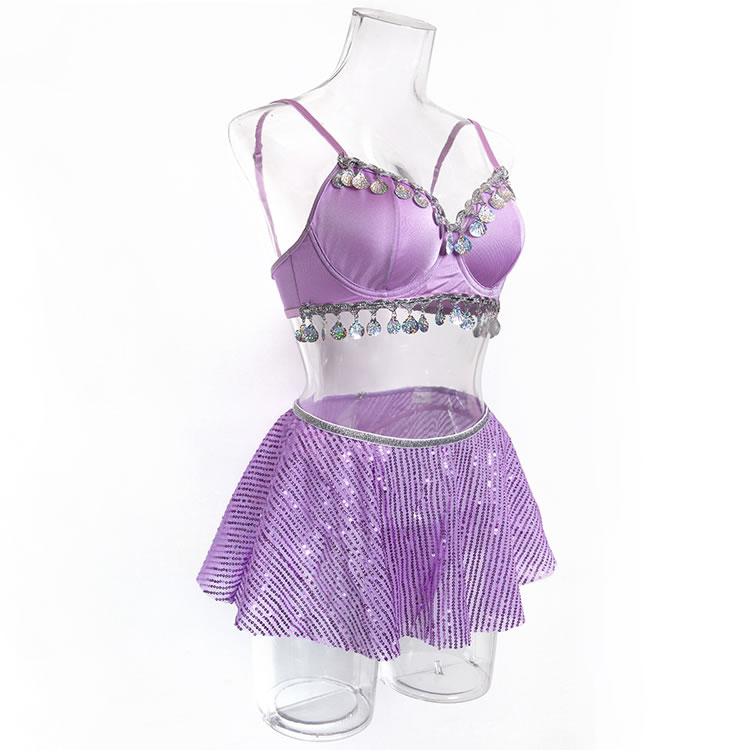 Designed to shine, this lavender lingerie set combines modern cut with dazzling details. The bra showcases a sleek silhouette with thin straps and decorative silver coin trim that adds texture and charm. The matching high-waisted skirt is fully lined with reflective sequins, creating a full, flirty flare that enhances every move. Whether worn as a costume, dance outfit, or bold nightwear, it’s a standout choice for those who love to express themselves with color and sparkle.