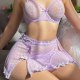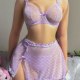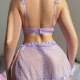 This soft lavender lingerie set features a sheer mesh bra with delicate Heart patterns and lace-trimmed straps, paired with a matching mini skirt. The design includes adjustable back clasps and a bow-tie waistband for a personalized fit, offering a sweet and playful look perfect for relaxed moments at home.