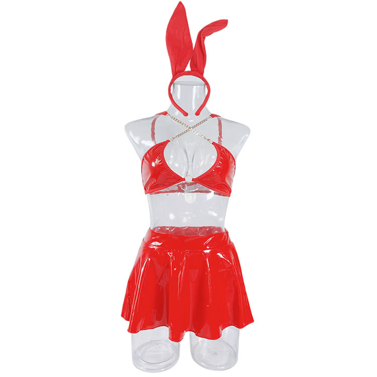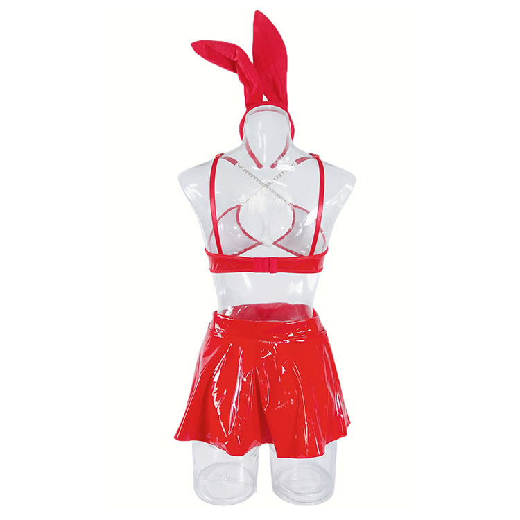 Well don't you look like a walking felony! Stun the admissions office with your curves and your wit in this Legally Lady Bunny costume featuring a vinyl bra top, triangle cups, criss-cross strappy bust detailing, a hook and eye back closure, a mini skirt, and a matching bunny ear headband.