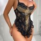 This daring bodysuit features a bold leopard print center panel framed by intricate black floral lace overlays. Designed with a structured bustier top and thin adjustable straps, it creates a flattering silhouette while offering a peek-a-boo aesthetic. The back showcases a sheer mesh panel that extends into a high-cut thong style, adding a modern edge to this playful ensemble. Perfect for making a statement, this piece combines wild prints with delicate lace detailing for a look that is both fierce and feminine.