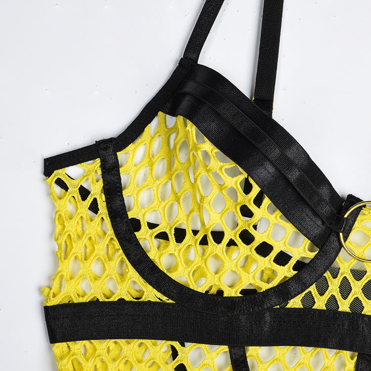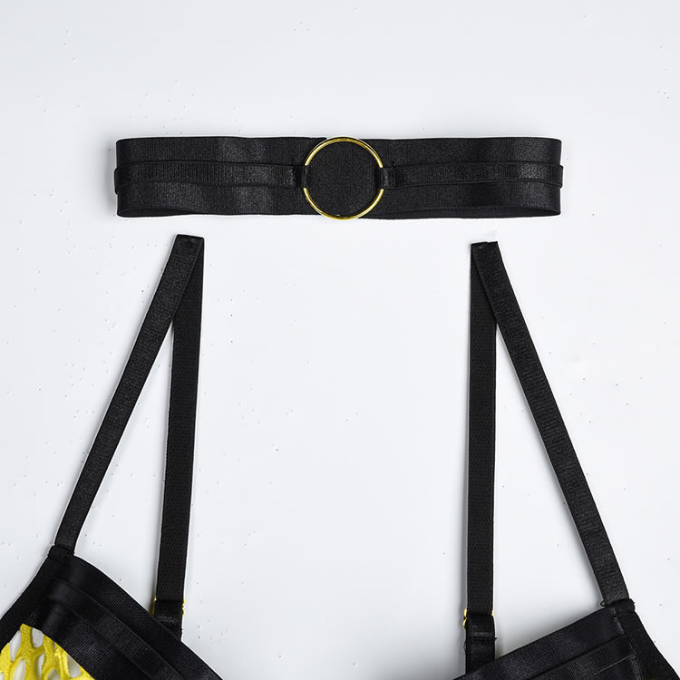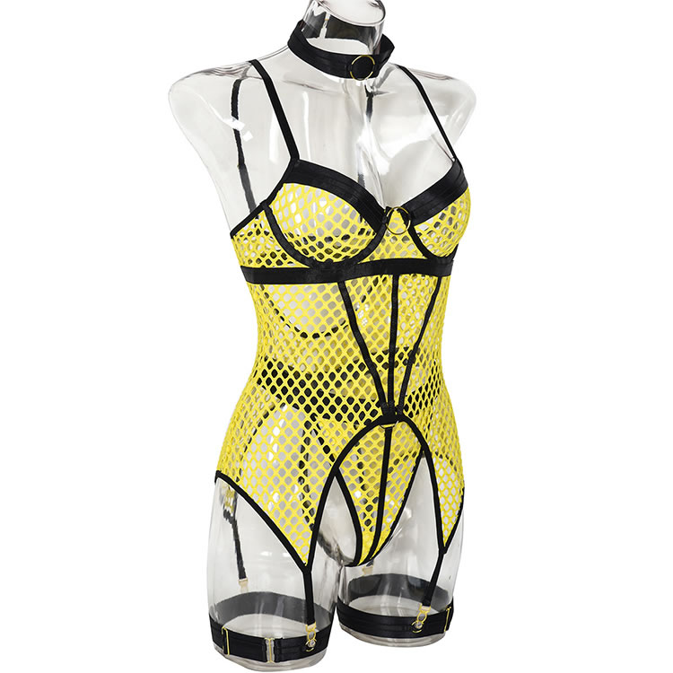 Ultra sexy yet romantic, this tempting bustier features sheer underwire cups with an O-ring details, an allover sheer honeycomb design, adjustable spaghetti straps, a hook and eye back closure, a sheer bodice, an open back panel, adjustable garter straps, adjustable leg garters, and a matching thong.