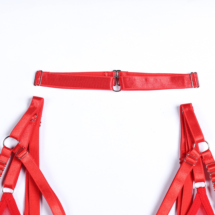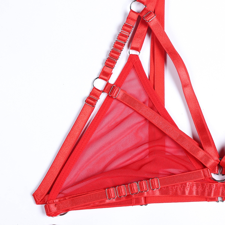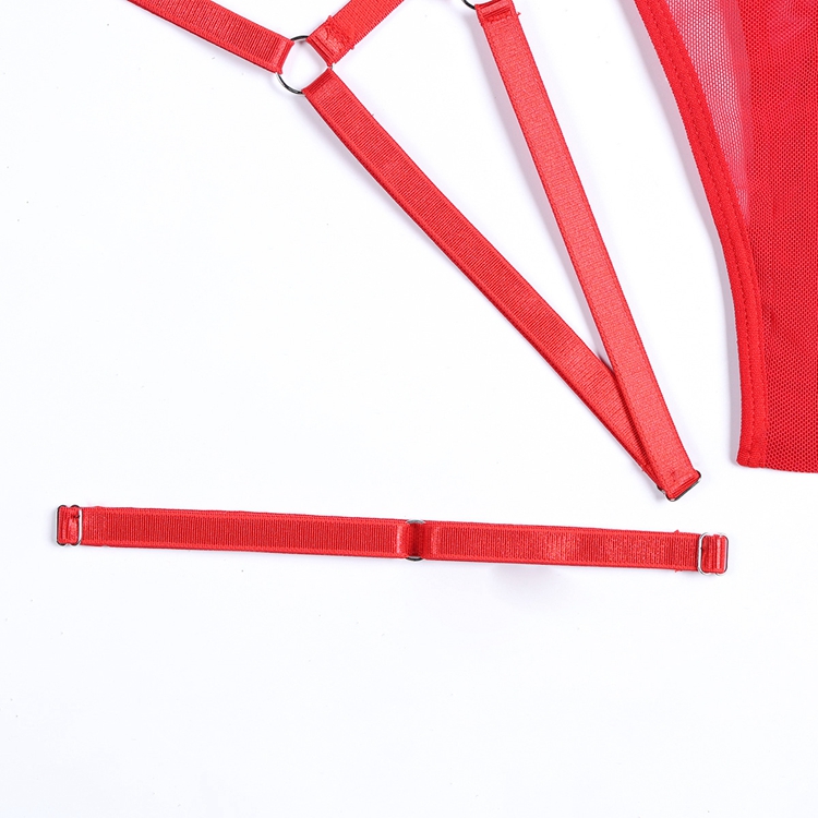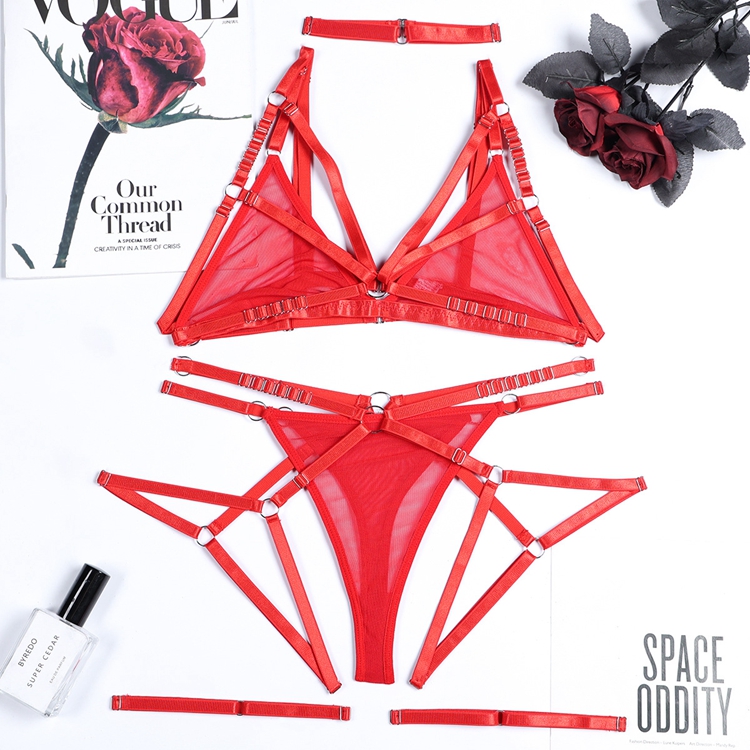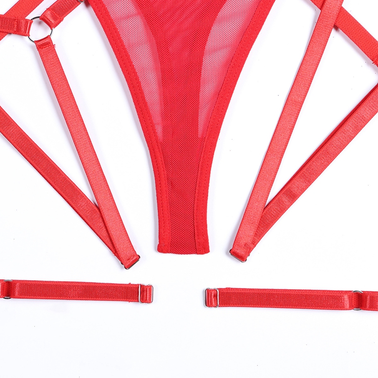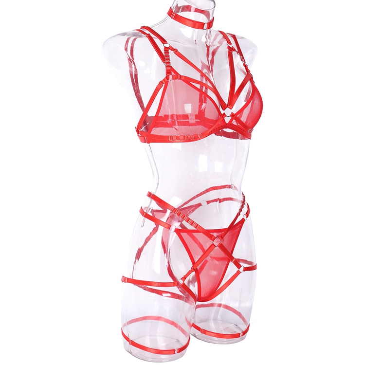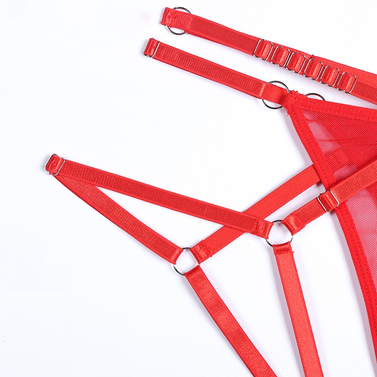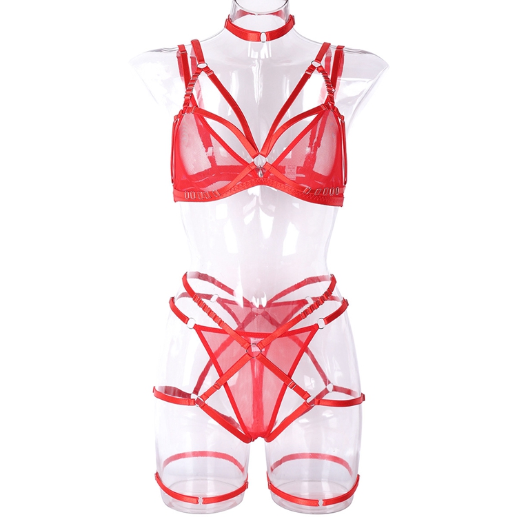 Your lover won't know how to react with you in this absolutely stunning bra set featuring sheer mesh cup, adjustable spaghetti straps, a hook back closure, and an open strappy cups with metal O-ring accents, adjustable spaghetti straps, a hook back closure, a matching high waisted garter belt, wraparound leg garters, and a matching panty with a thong cut back. (Choker included.)