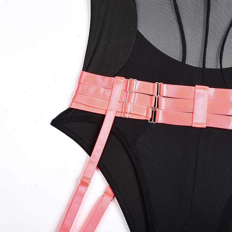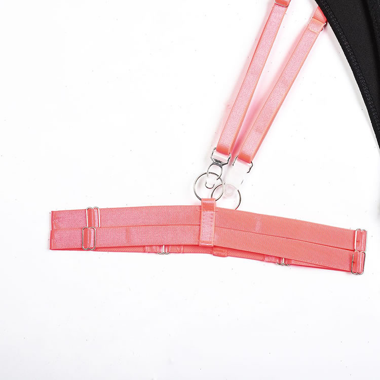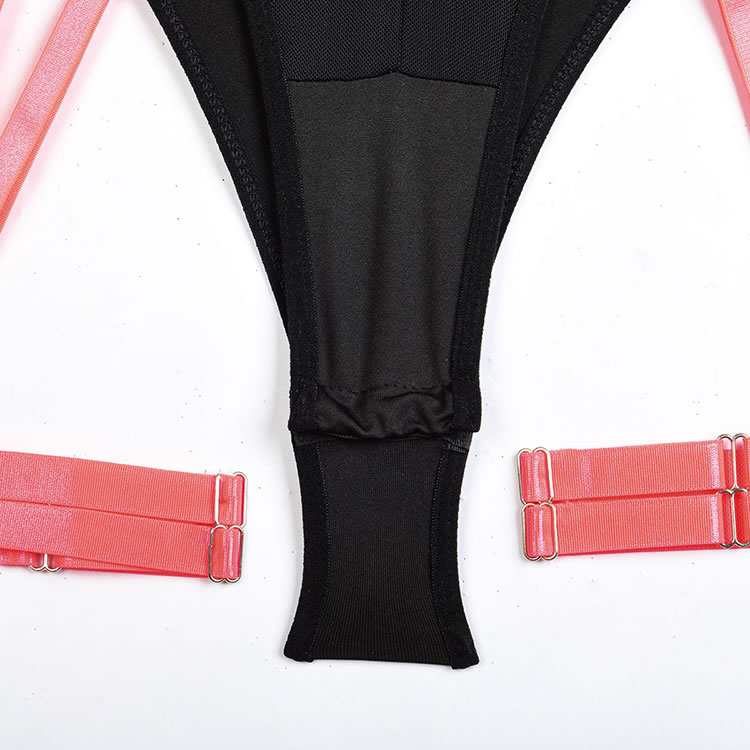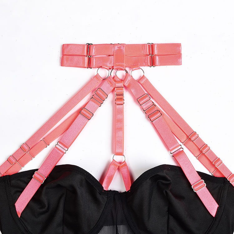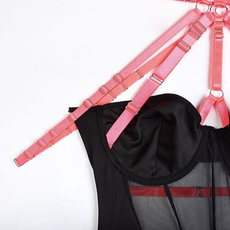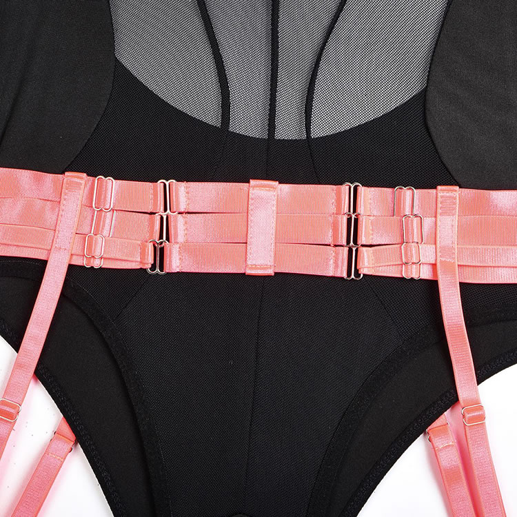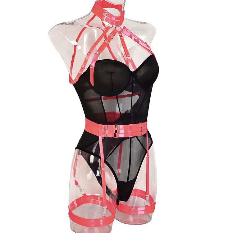 Give your lover a sexy eyeful in this exclusive teddy set featuring underwire cups, an adjustable choker neck with adjustable straps, a sheer mesh bodice, a hook back closure, a high cut leg, a thong cut back, a strapped garter belt with adjustable garter straps, and adjustable strapped leg garters.