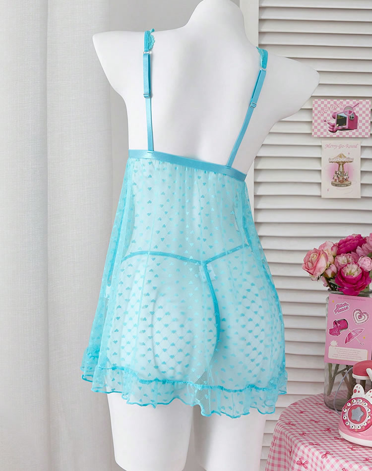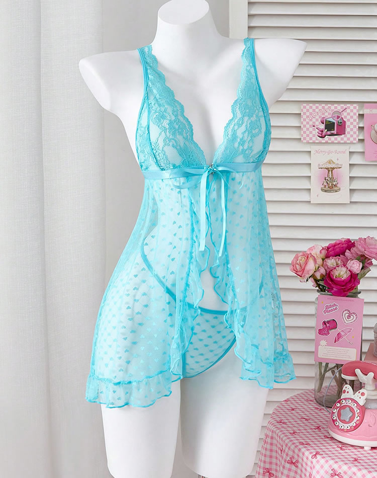 This sweet and flirty lingerie brings a playful touch to your nightwear with its delicate lace trim and sheer mesh overlay. The deep V-neckline detail add a hint of charm, while the ruffled hem gives it a soft, feminine flair. Designed for those who love a cute yet sexy look, this set is perfect for lounging, romantic evenings, or adding a whimsical vibe to your intimate moments.