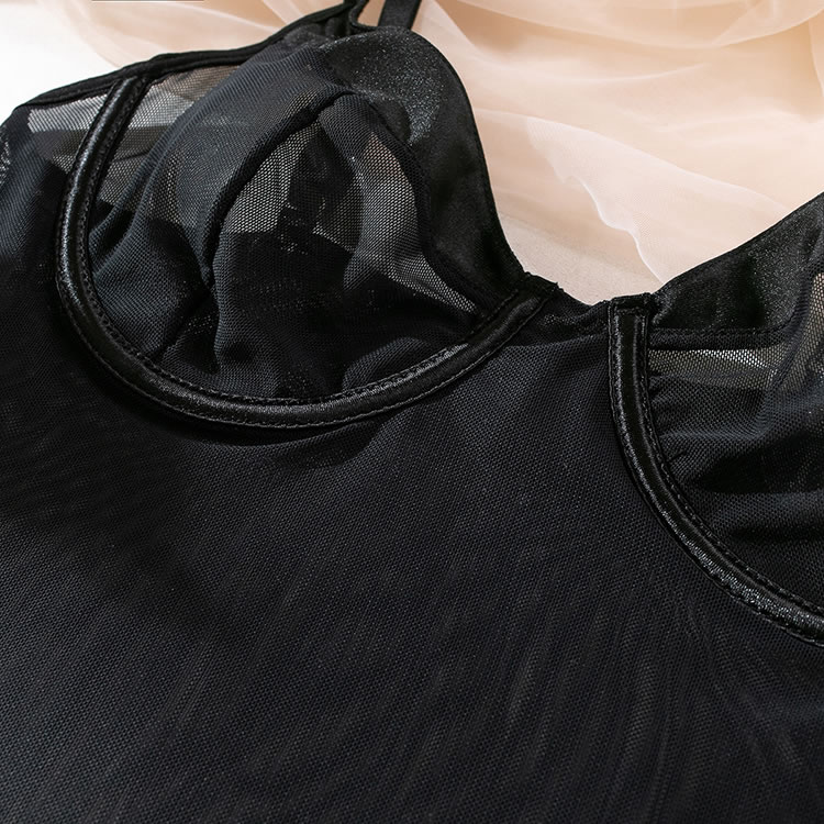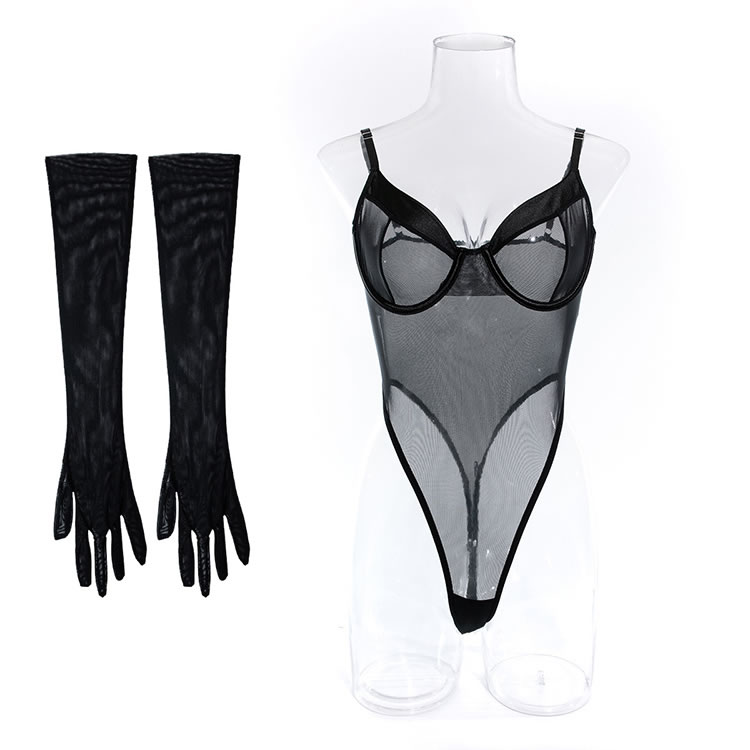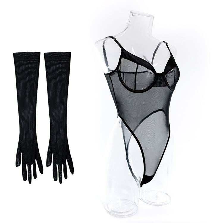 Draw your lover's eyes downward in this provocative teddy featuring underwire cups, adjustable spaghetti straps, a sheer mesh bodice, high cut leg, a snap crotch, a thong cut back, and a matching long black gloves.