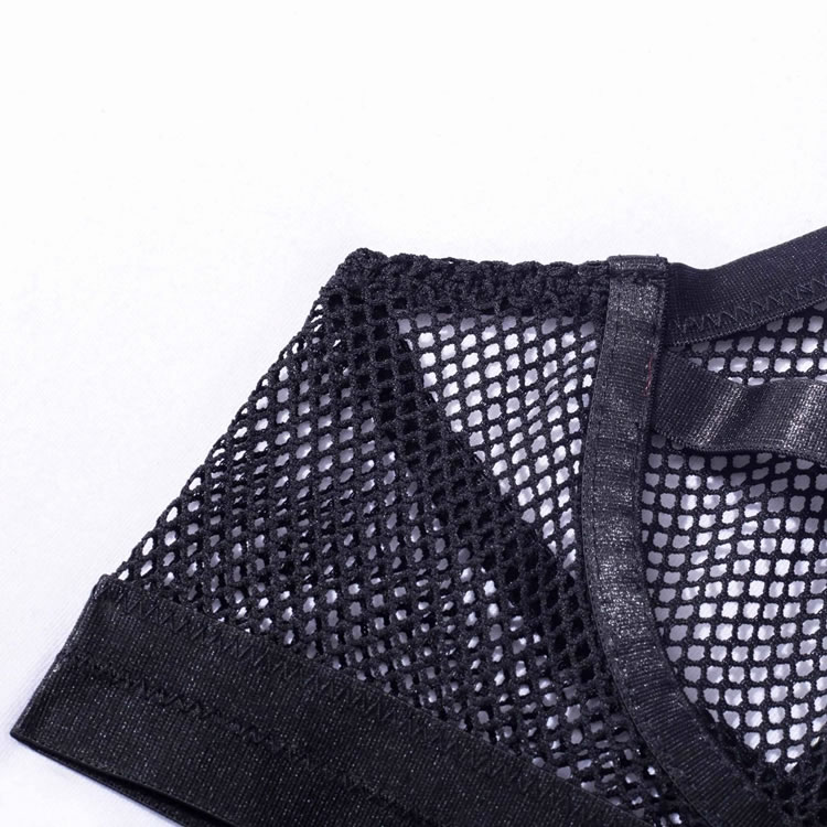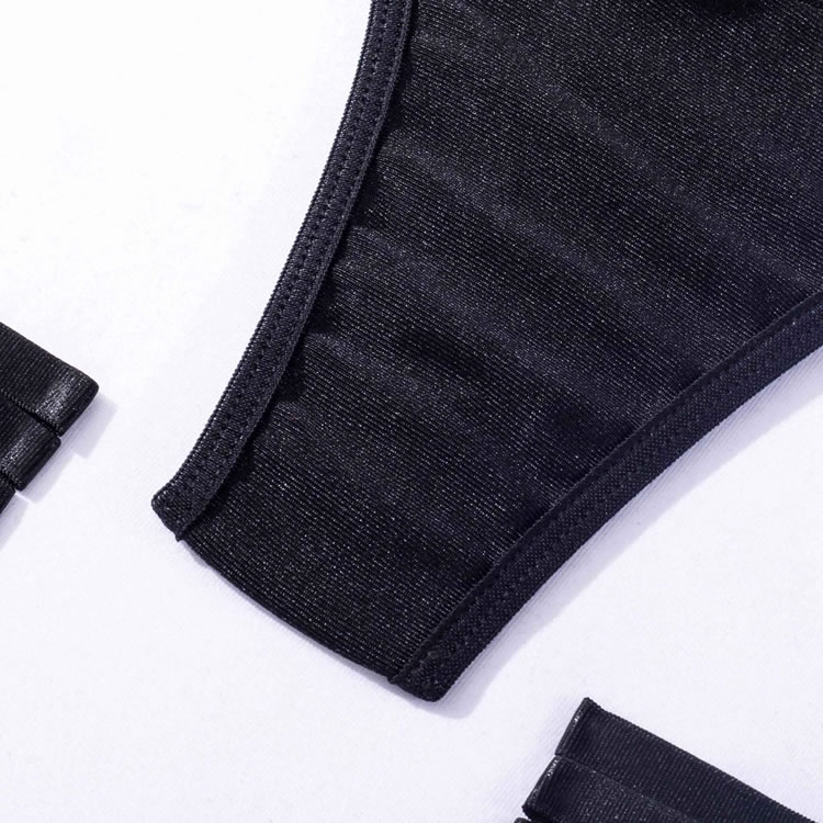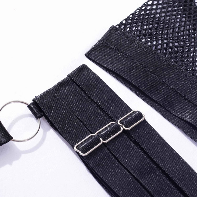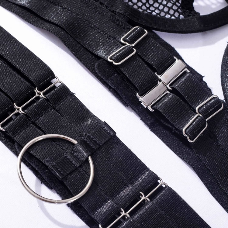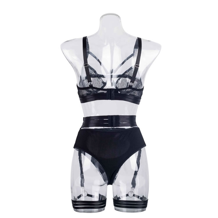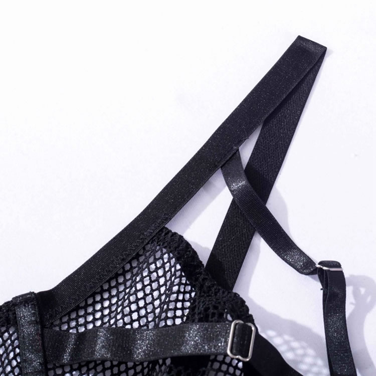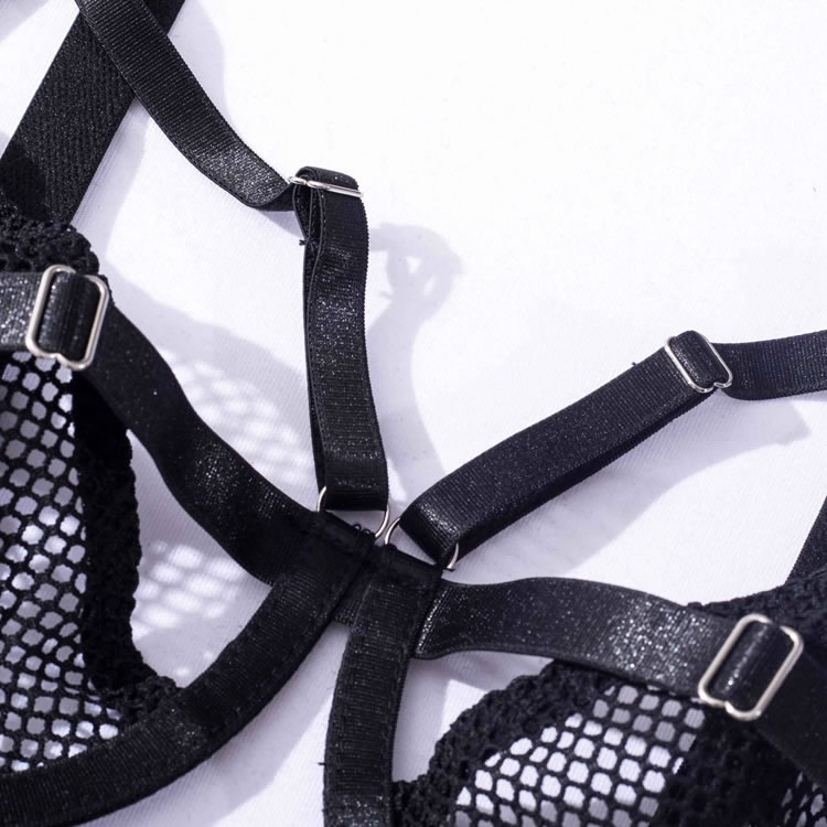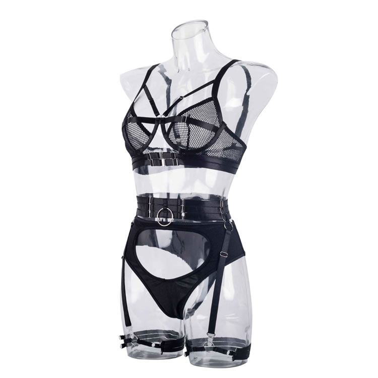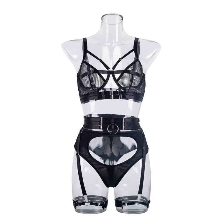 Give your lover a sultry surprise in this lingerie set featuring sheer mesh underwire cups with strappy bust detailing, adjustable spaghetti straps, a hook and eye back closure, a matching garter belt with adjustable garters, wraparound leg garters, and a matching cut-out panty with a cheeky cut back.