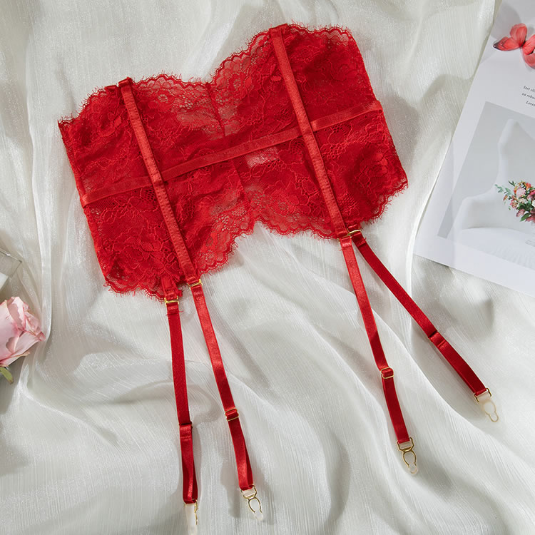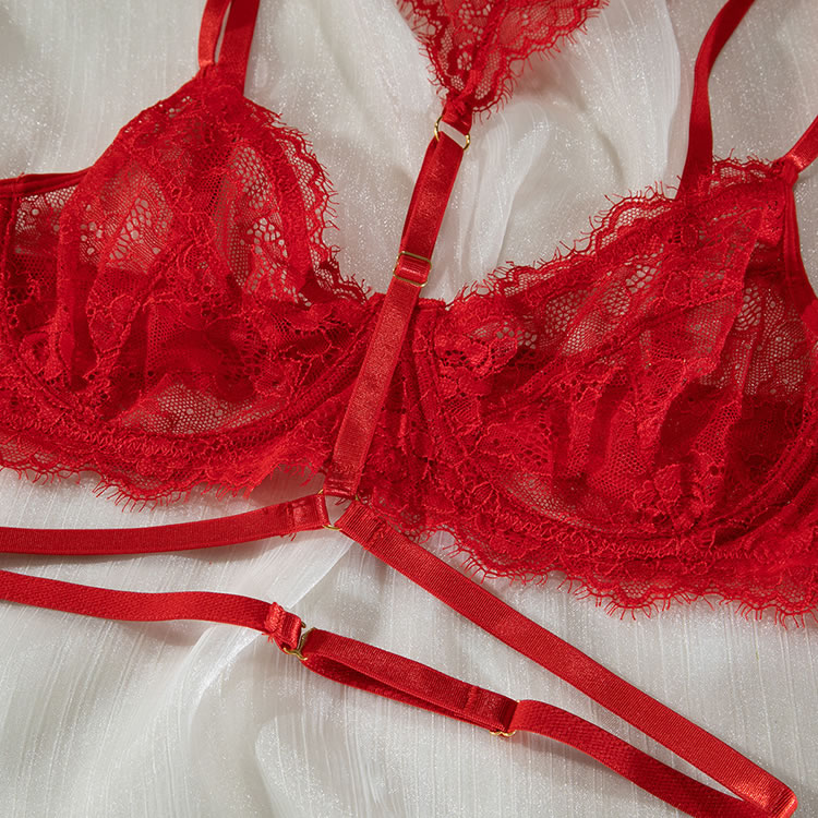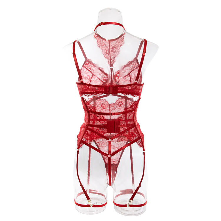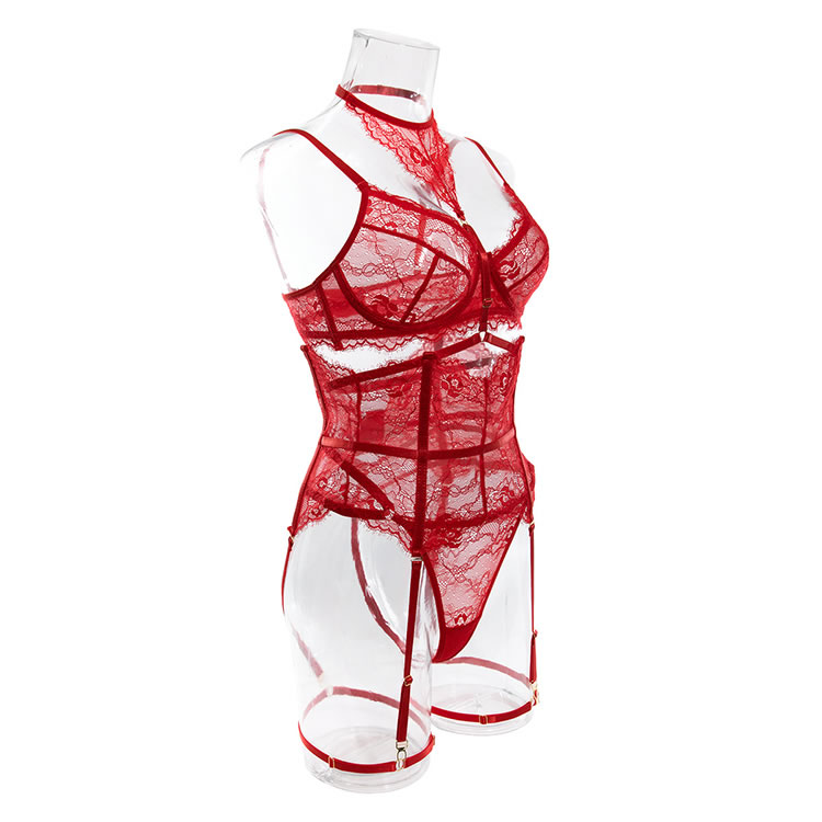 Allure your lover in this seductive bra featuring sheer lace cups with underwire, adjustable spaghetti straps, a hook and eye back closure, a choker harness with sheer lace accents, a matching high waisted garter belt with a hook and eye back closure, adjustable garter straps with wraparound leg garters, and a matching panty with a thong cut back.