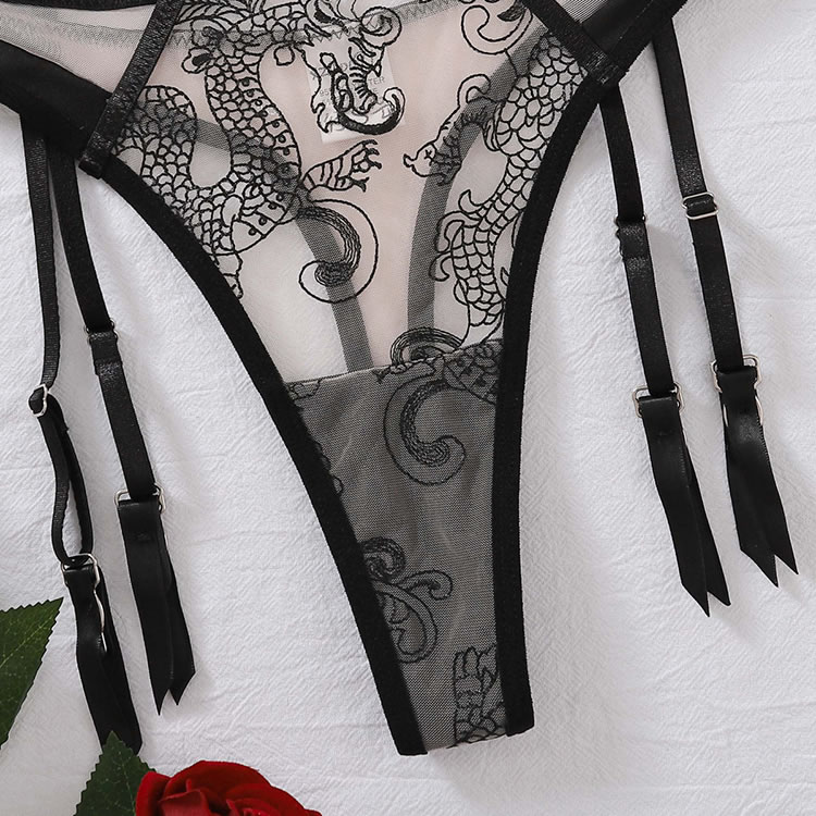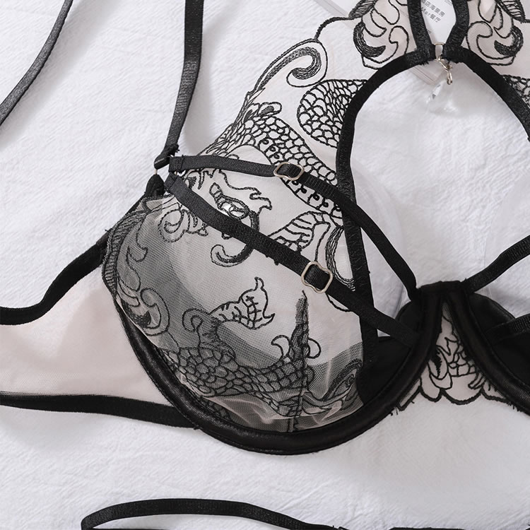 Embrace a captivating look with this enticing mesh bra set, featuring sheer mesh underwire cups with playful strappy detailing across the bust. Adjustable spaghetti straps ensure a perfect fit, while the hook and eye back closure adds convenience. Complete the look with a matching high-waisted garter belt with adjustable straps and a cheeky panty, making this set the ultimate in seductive style.