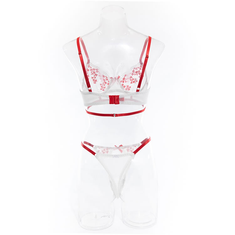 Blossom into a sexual diva in this gorgeous bra set featuring sheer mesh underwire cups with red floral embroidery, adjustable spaghetti straps, a strappy underbust with a back hook closure, a hook and eye back closure, and a thong panty with an adjustable waistband.
