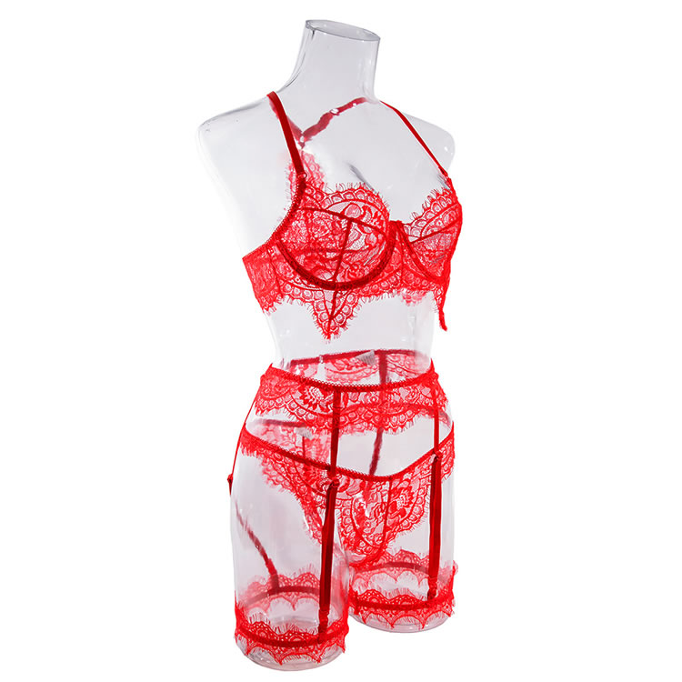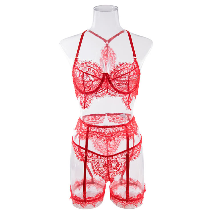Amp up your seduction game in this exclusive bra set featuring sheer lace underwire cups, adjustable spaghetti straps, a racerback, a matching garter belt with adjustable garter straps, wraparound leg garters, and a matching panty.