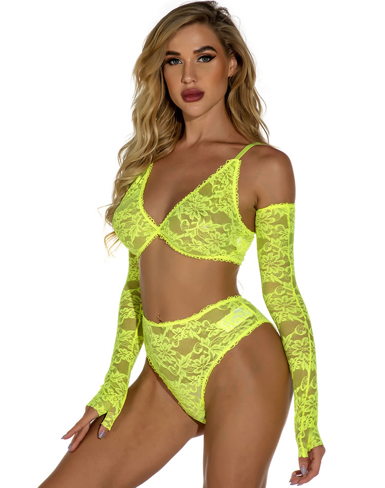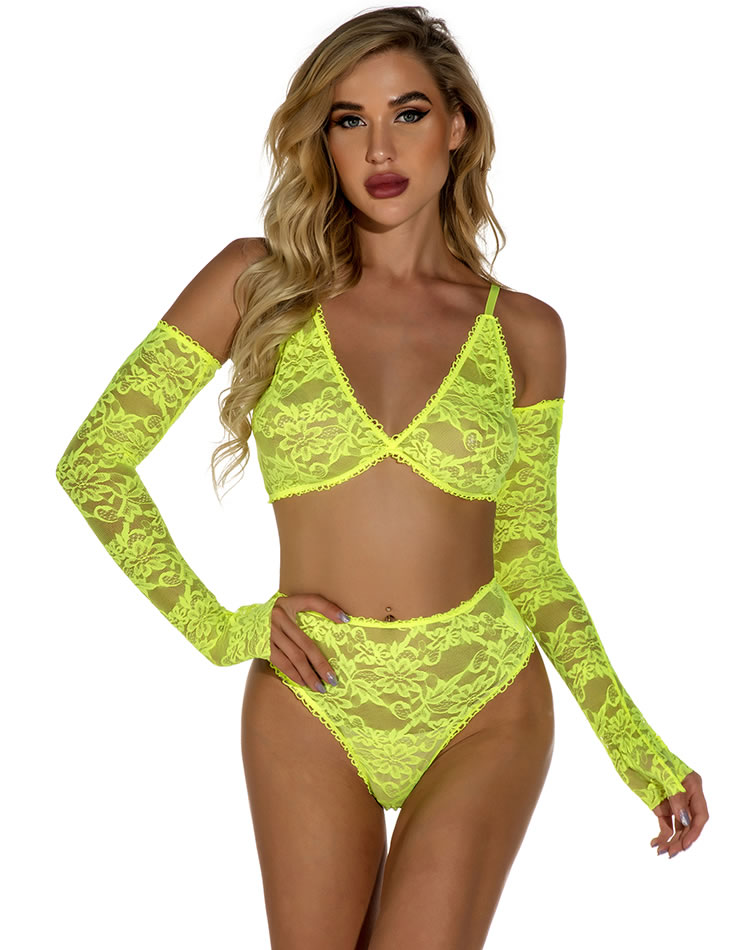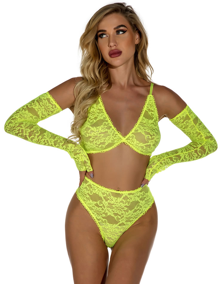 Neon all the way, baby. Play promiscuously in this bra set featuring sheer lace cups, adjustable spaghetti straps, a matching high waisted panty, a cheeky cut back, and matching fingerless gloves.