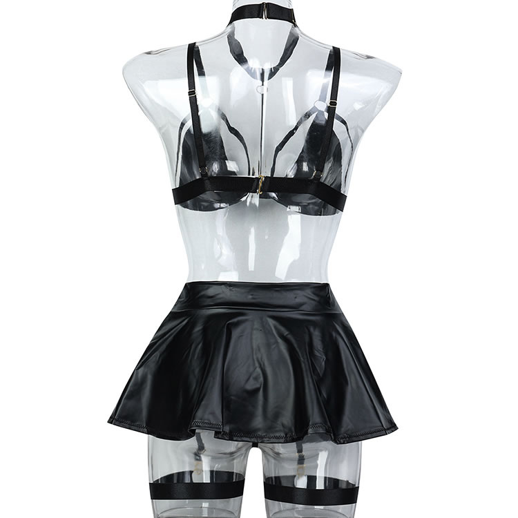 Make a daring statement with this bold and edgy faux leather lingerie set, designed for those who love to stand out. The set features a structured strappy bra with gold accents and a matching high-waist thong for a sleek, modern look. The standout piece is the faux leather mini skirt with attached garters, adding an extra layer of intrigue and allure.
