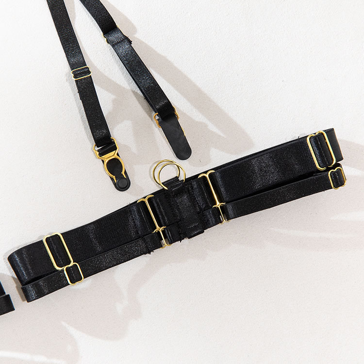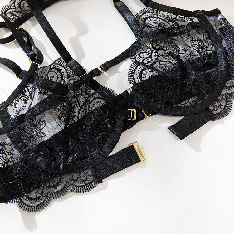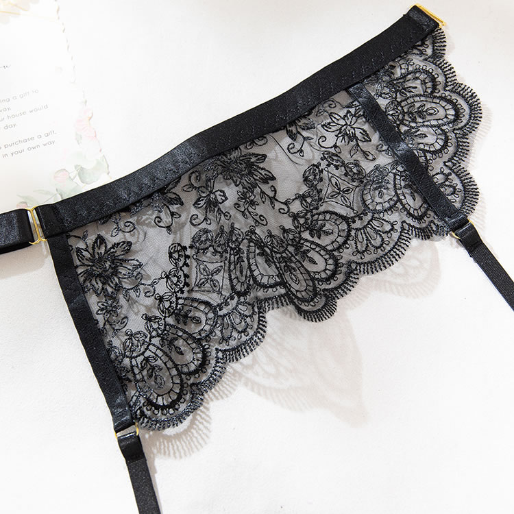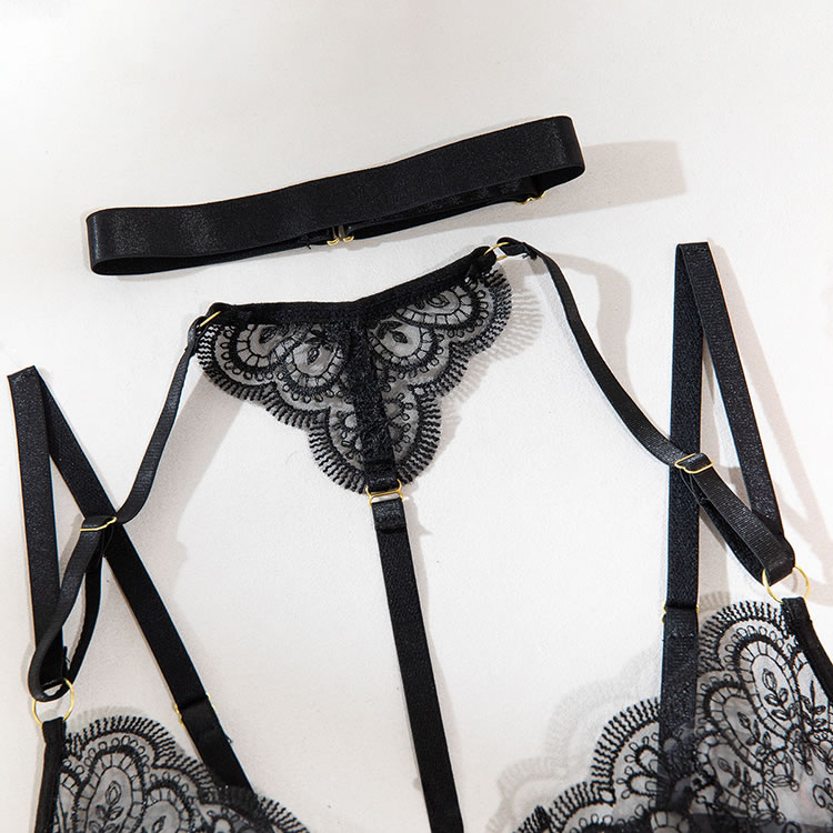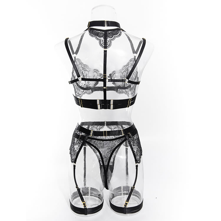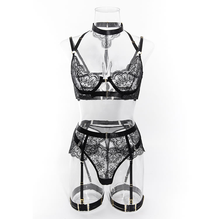 Tempt your love in this sexy bra set featuring sheer lace underwire cups, adjustable spaghetti straps, a front hook closure, a high choker neckline, a matching high waisted garter belt with adjustable garter straps, wraparound leg garters, and a matching thong panty.