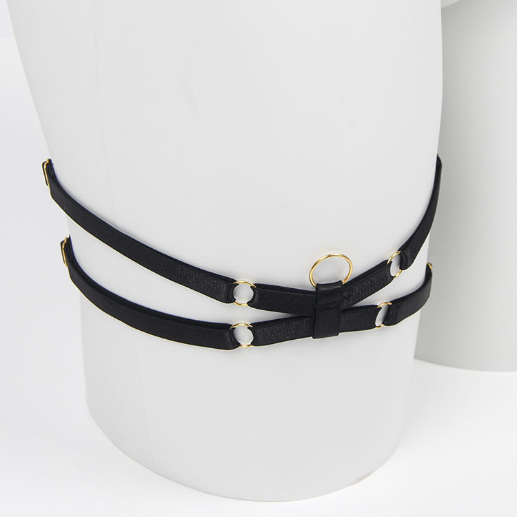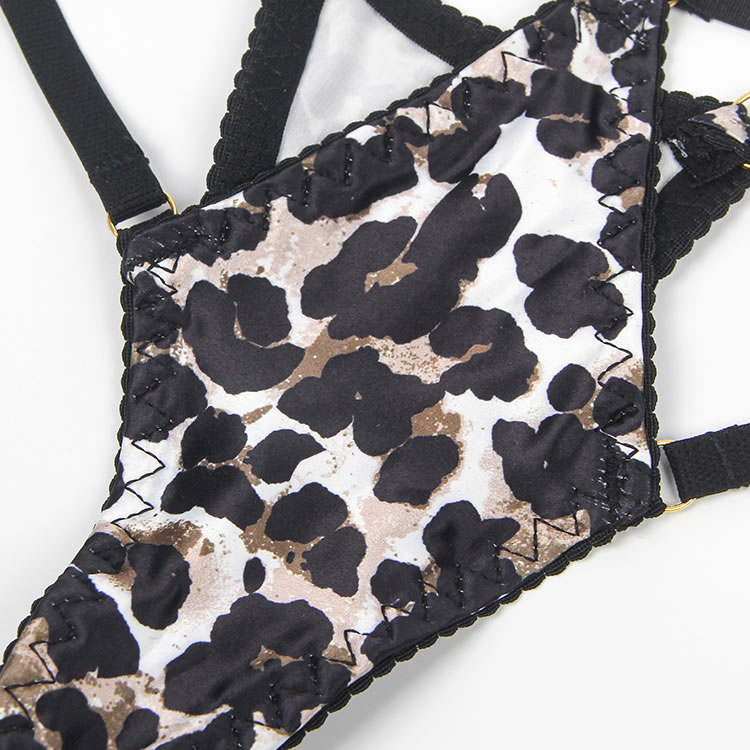 Dare to wear this irreverent bra set featuring open underwire cups with strappy detailing, halter straps, adjustable spaghetti straps, a hook back closure, a matching cut-out panty with a thong cut back, and a matching strappy garter belt with adjustable wraparound leg garters.